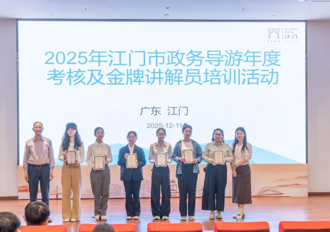 值得一提的是,在证书颁发仪式上,一批表现优异的讲解员被授予江门市2024至2025年度“金牌讲解员”称号;同时,新一批政务导游员获颁2026年度聘书,星级政务导游员名单也得以更新。这份荣誉既是对过往成绩的肯定,更是对未来责任的赋予。