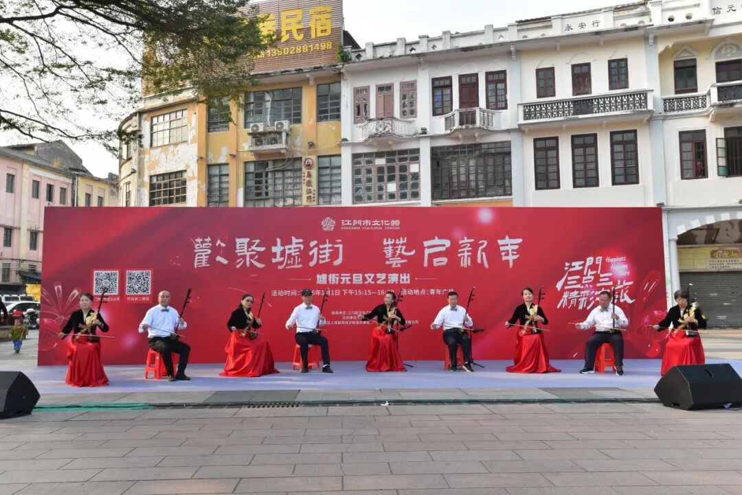 1月1日下午,伴随着新年的第一缕暖阳,“江门三点三精彩之旅·墟街有戏”系列活动之“欢聚墟街 艺启新年”元旦文艺汇演在长堤青年广场欢乐上演。本次活动由江门市文化广电旅游体育局指导、江门市文化馆主办,汇集江门市文化馆文化志愿者艺术团及江门本土优秀艺术家,以骑楼为幕、街巷为台,为市民、游客呈现了一场兼具传统韵味与时代气息的新年艺术盛宴。