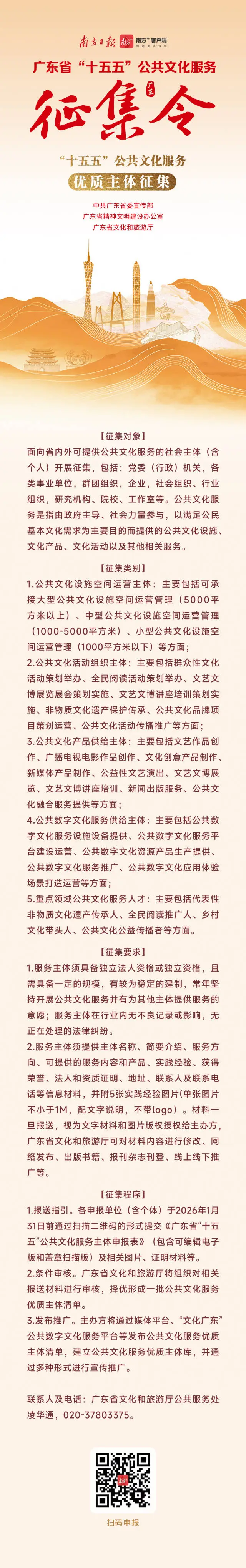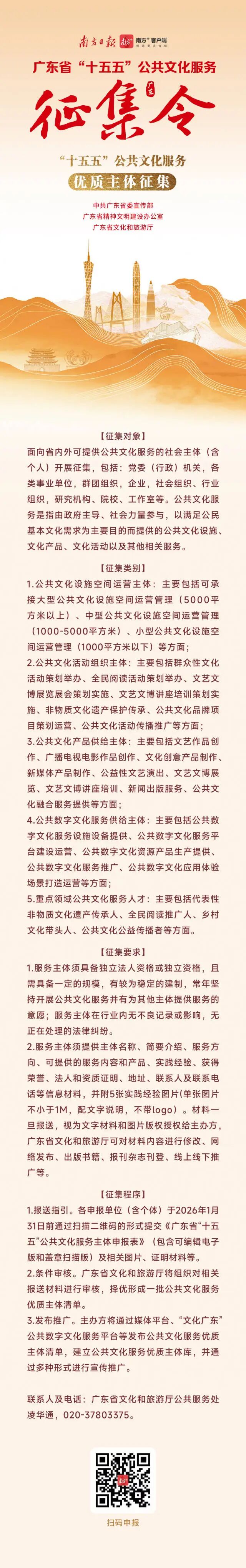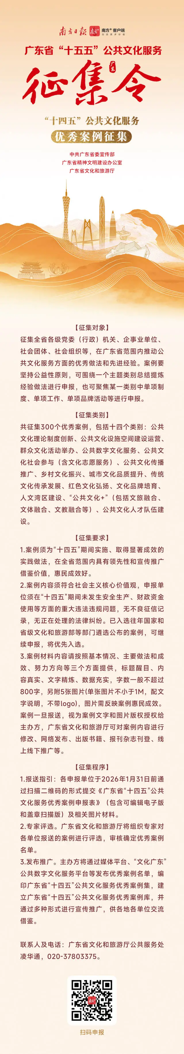 答:不复杂!2026年1月31日前,通过南方+、“文化广东”平台等渠道扫码就能提交材料。需要填写申报表,附上案例或主体介绍、图片等佐证材料。二维码就在征集令里,轻松扫码、一键参与!