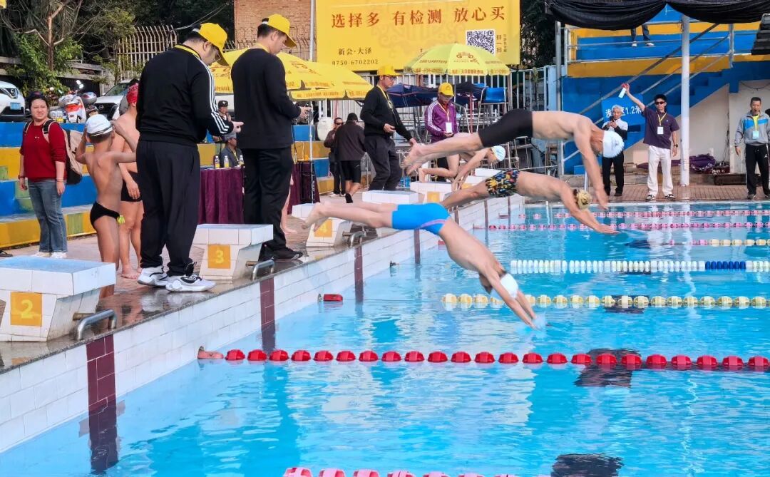 本次比赛由新会区文化广电旅游体育局指导,新会区冬季游泳协会主办,新会古典家具城(组团)承办,广东大有食品股份有限公司支持。赛事涵盖儿童组(6-12岁)至E组(65岁以上)七个年龄组别的比赛,包括自由泳、蛙泳、蝶泳、仰泳等单项及多项接力项目,全方位满足不同年龄段爱好者的参赛需求。本届赛事规模较去年增加80余人,总人数突破300人。参赛选手不仅覆盖全区各镇(街)的本地游泳爱好者,更吸引番禺等地游泳协会组团参与。