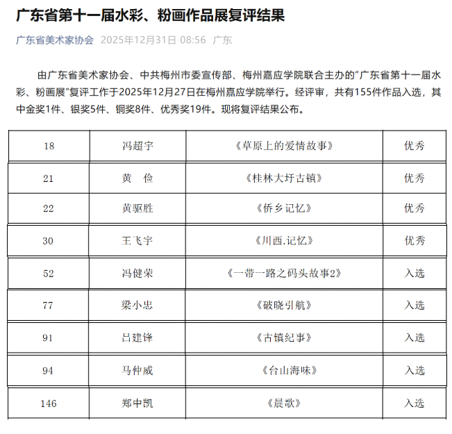 由广东省美术家协会、中共梅州市委宣传部、梅州嘉应学院联合主办的“广东省第十一届水彩、粉画作品展”的复评结果于2025年12月31日在广东省美术家协会官网公布。经专家评审,最终评出155件入选作品。在此,特向获得佳绩的江门市美术家表示热烈的祝贺!