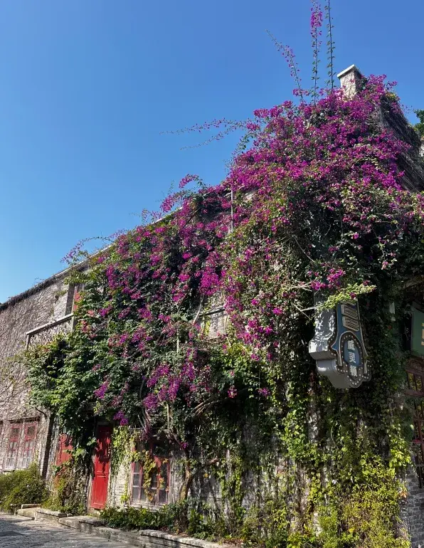 冬日的繁花,为厚重的历史增添了灵动生机。踏入古镇,紫红、粉红、橙黄等各色三角梅花瓣簇拥成墙,有的花枝垂落形成浪漫的花瀑,成为游客打卡的首选机位。