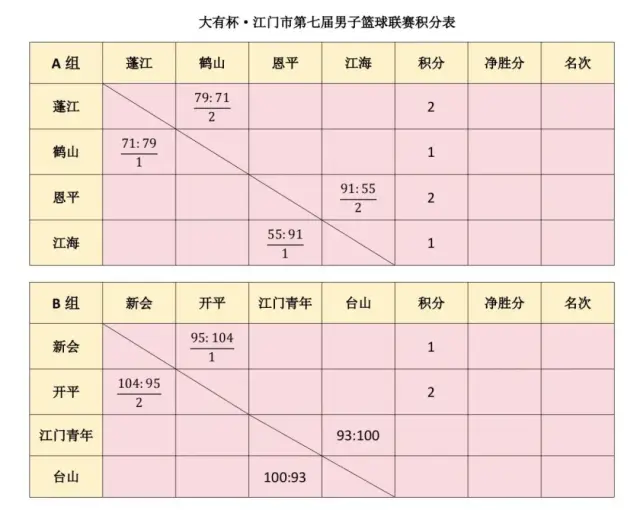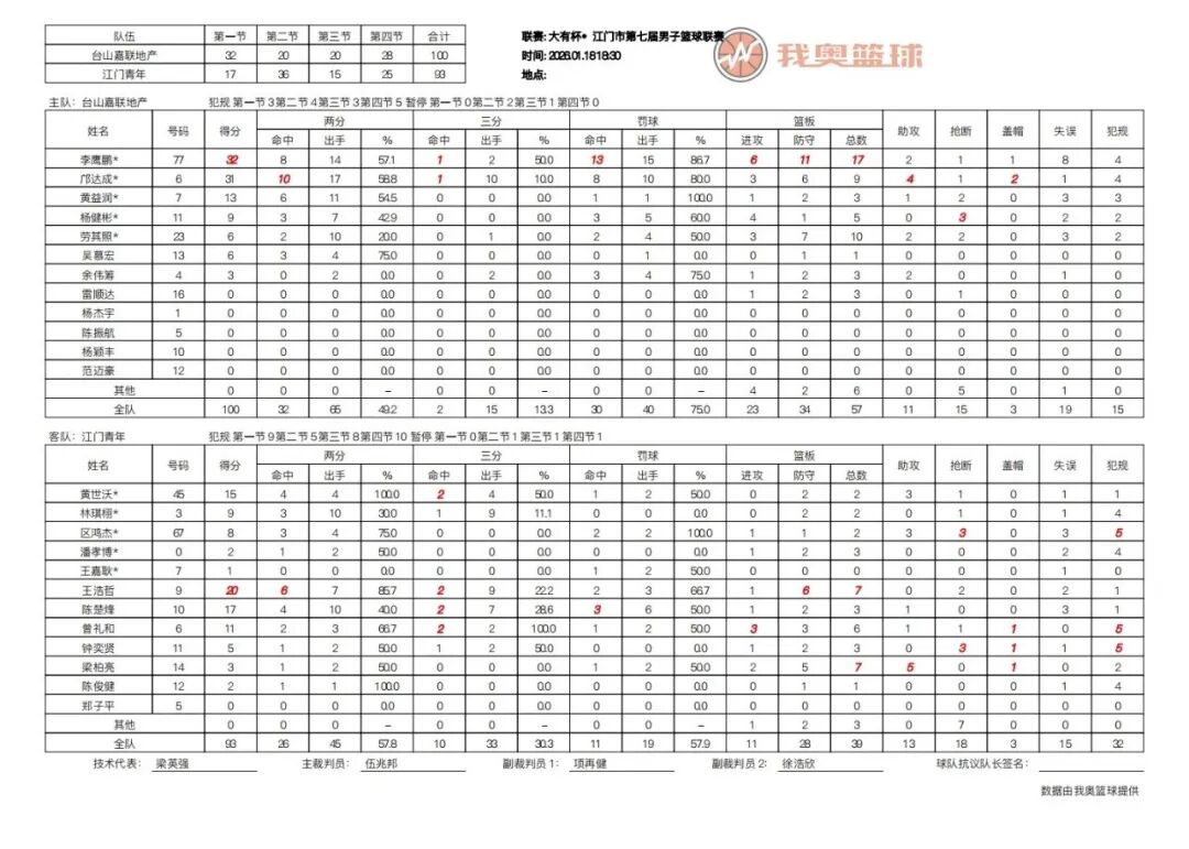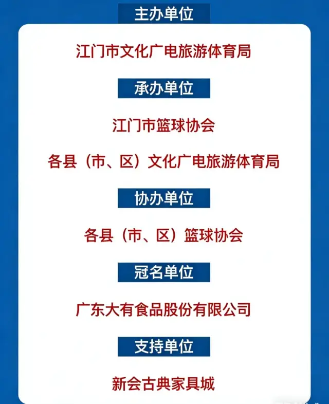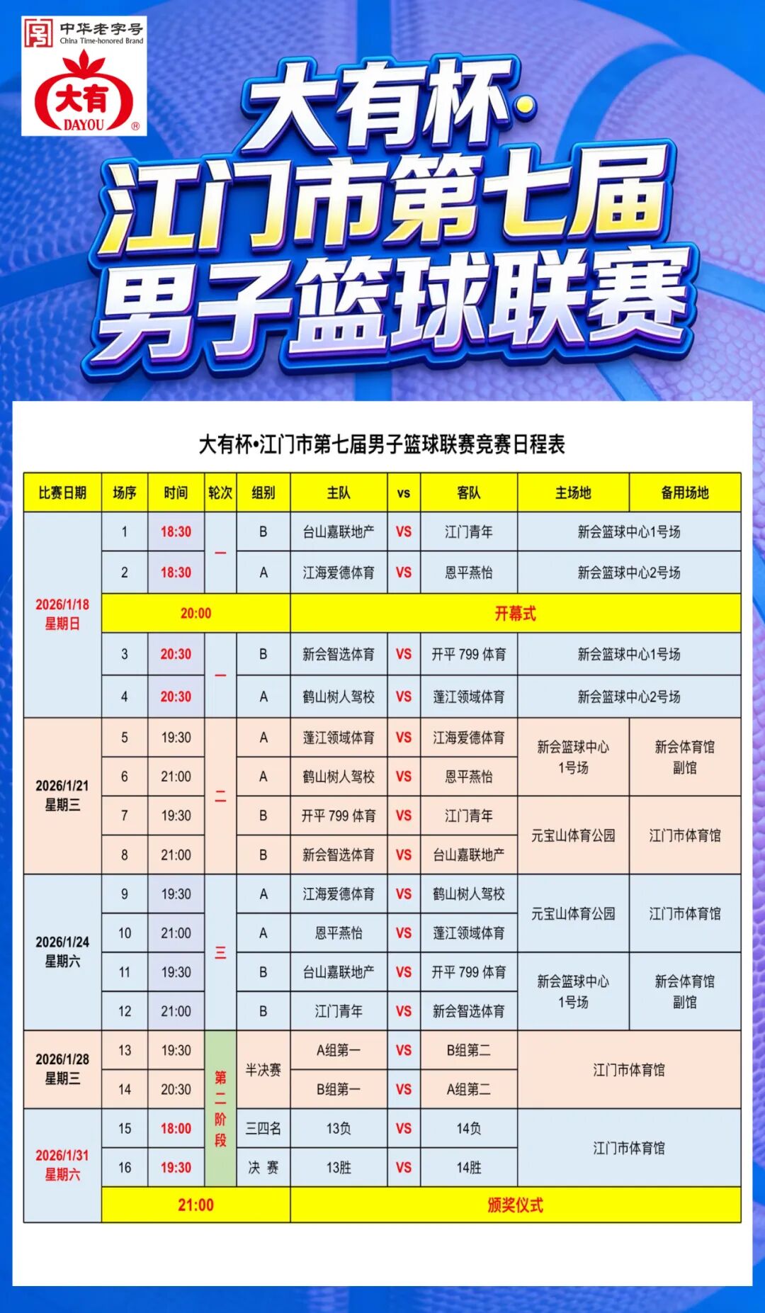 1月18日晚,大有杯•江门市第七届男子篮球联赛在新会篮球中心隆重开幕。首轮比赛精彩纷呈,火力全开,最终恩平、台山、蓬江、开平喜获开门红。本届比赛共有八支队伍参加,其中江门青年队只参赛不参与排名,旨在给年轻运动员一个高水平的锻炼平台,为江门篮球后备人才培育助力发展。另外来自四市三区的7支队伍均是以现籍户口为报名资格,各队伍认真组织了本地区最强阵容参加此次联赛,真正营造了为家乡而战,为家乡增光的良好氛围。