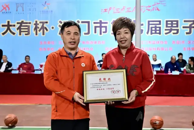江门市文化广电旅游体育局副局长 柳超球向本届联赛冠名单位:大有食品股份有限公司颁发感谢状