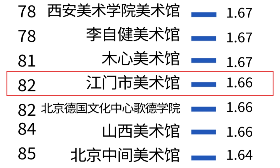 榜单评选综合了全年多项公众热度数据,在竞争激烈的全国美术馆竞争中,作为美术馆大省的广东表现突出,共有11家美术馆入围百强榜单。据不完全统计,全国各类型美术馆总数不下2000余家,其中截至2025年初,全国民营美术馆总数已增至983家,在如此众多的美术馆中,江门市美术馆能够名列百强,实属不易。自江门市政府着力打造“华侨华人文化交流合作重要平台”以来,我局全面落实市委、市政府提出的“侨都赋能”“人才倍增”工程部署,强势推动全市文化场馆全面提升,在赋能各馆高质量跨越式发展工作指导下的各场馆精耕细作、努力作为的阶段性成果的一个侧面反映。