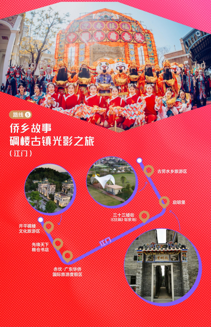 线路:古劳水乡旅游区——长堤历史文化街区、启明里——开平碉楼文化旅游区——先锋天下粮仓书店——赤坎华侨古镇