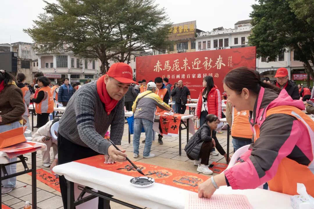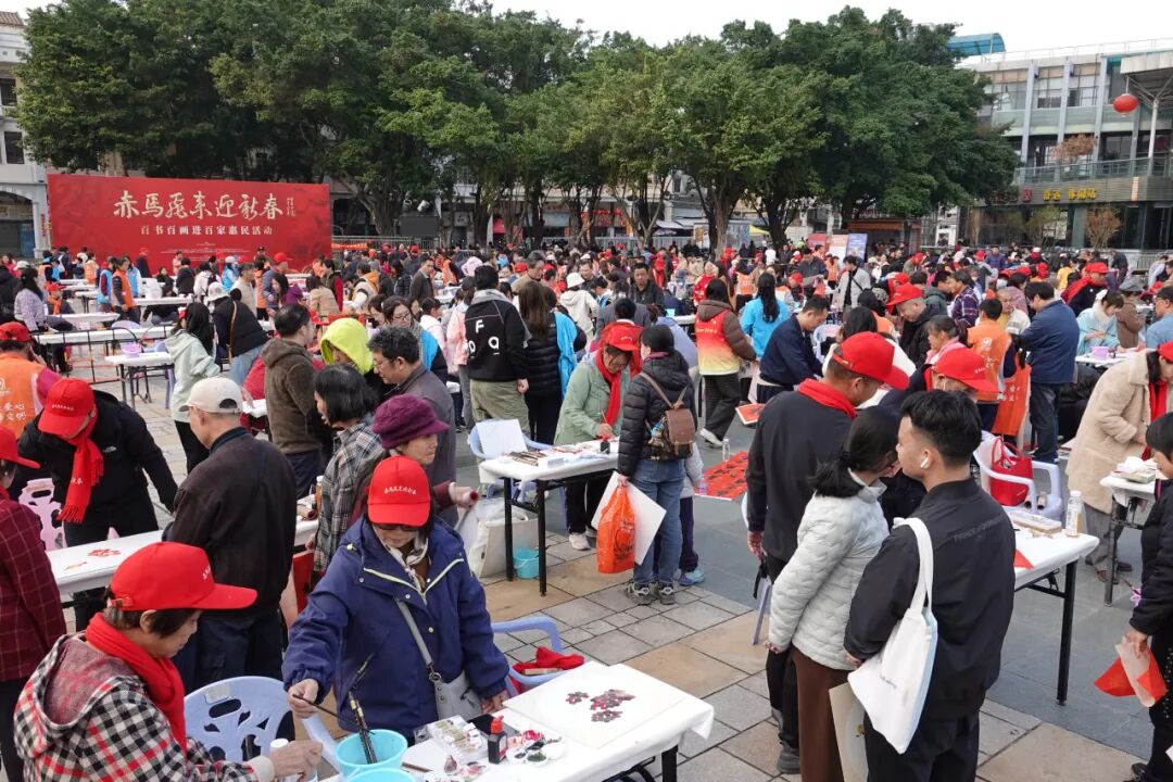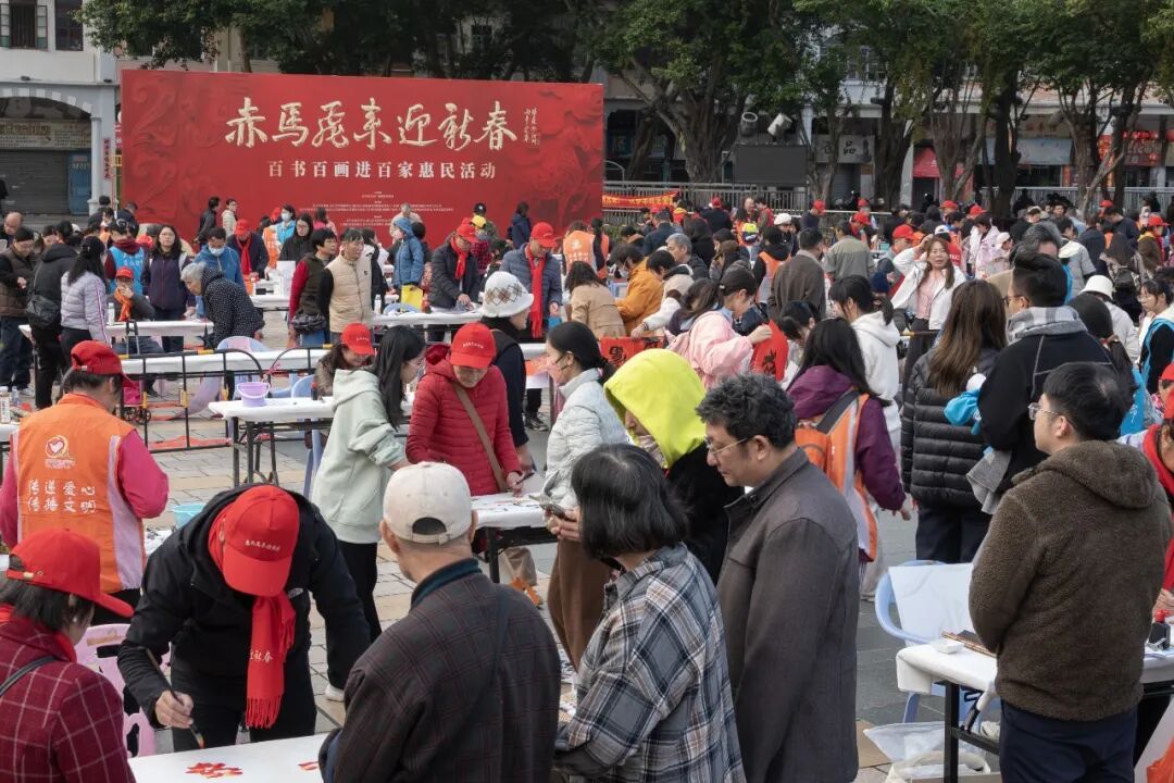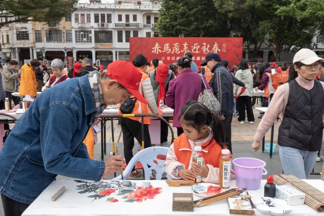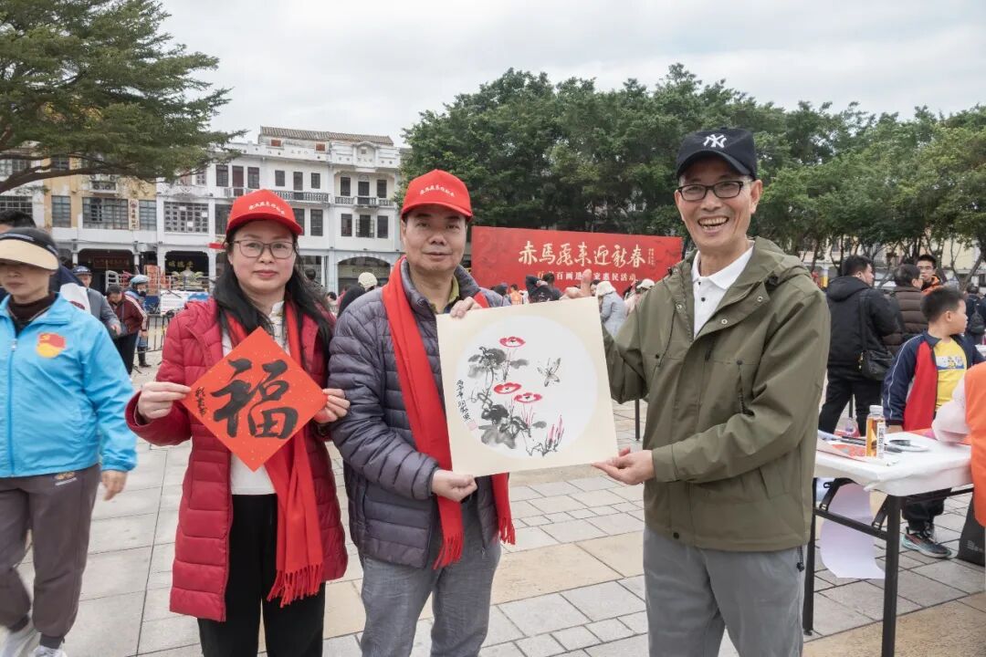 1月31日下午,“我们的节日·春节 赤马飞来迎新春——百书百画进百家惠民活动”在蓬江区长堤广场举行。活动特邀江门市百位知名书画家现场挥毫,把新春祝福以传统书画艺术的形式送至千家万户,为广大市民奉献了一场别开生面的文化惠民盛宴。本次活动由江门市文化广电旅游体育局主办,江门市美术馆、江门市中国画学会、蓬江区人民政府白沙街道办事处等联合协办,共向市民游客赠送出对联、福字、国画小品近两千件。
