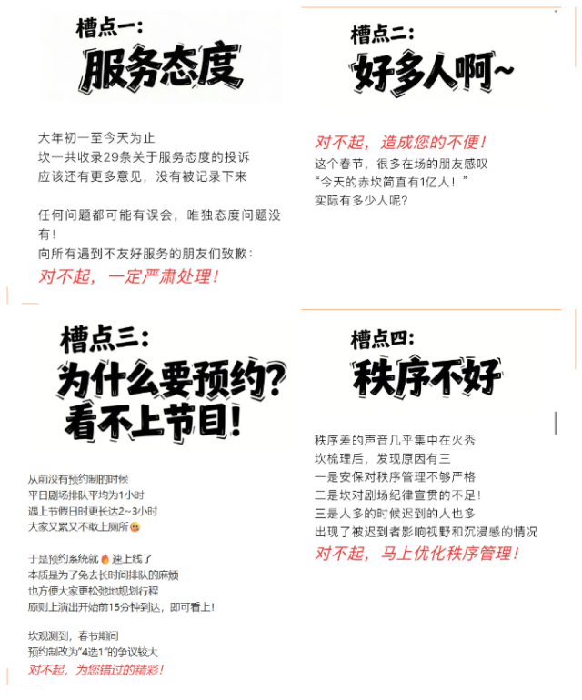 景区官方通过微信公众号用“四个对不起,三个感谢”大张旗鼓地向游客道歉,为景区春节期间收到的“29条关于服务态度的投诉”、客流拥堵、室内表演采取预约制以及现场秩序等多个遭遇质疑和批评的问题作出解释、给出改进承诺。