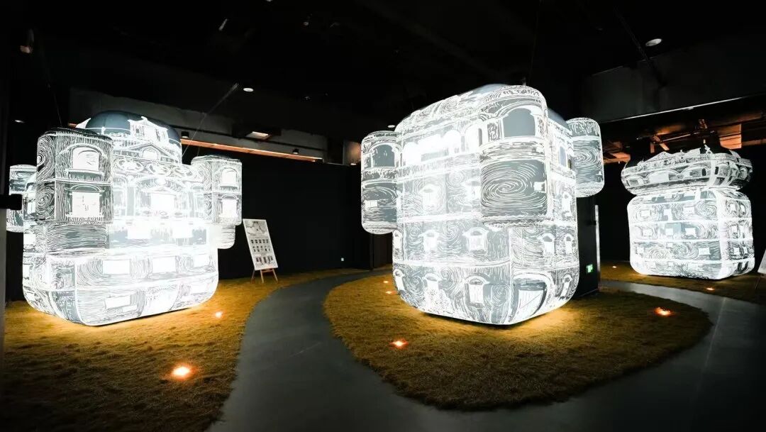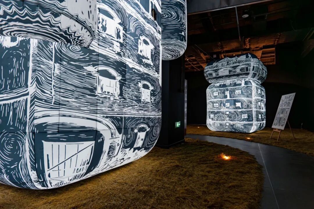 尤其是展览第五部分创新尝试无实物展品表达,设置四座体量巨大的气模碉楼,以印象派版画的斑驳质感矗立在氤氲水雾的稻田之中,朦胧光影交织出如梦似幻的意境。