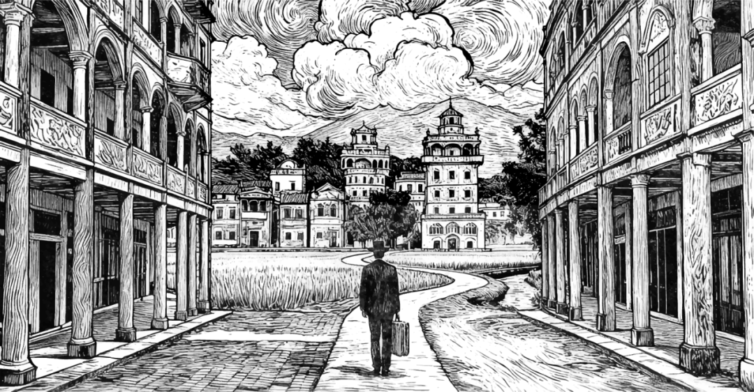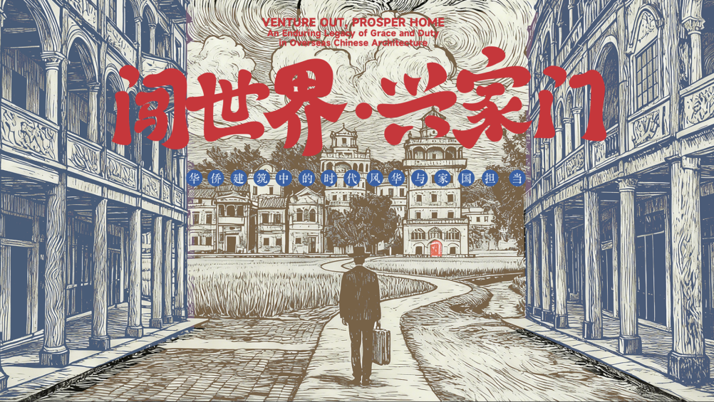 展览海报采用版画线条设计,版画强烈的黑白对比与流动线条,两侧骑楼形成的 “门廊”,既是街巷通道,也象征 “门里是家园,门外是世界” 的侨乡精神。提箱而行的旅人背影,藏着闯世界的勇气与归乡兴家的牵挂,中西合璧的建筑符号,见证着侨乡文明交融的智慧与 “心系桑梓、胸怀家国” 的赤子初心,定格了百年侨史里最动人的乡愁与担当。