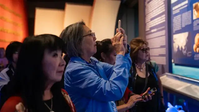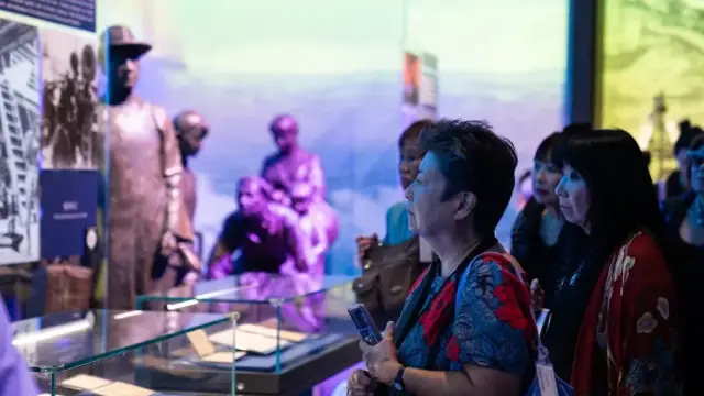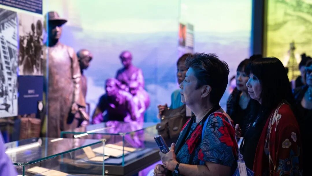 剧组奶奶们跟随讲解员进入展厅参观,她们穿过熙熙攘攘的人群,仔细观看展板,展板记载着华侨们背井离乡,漂洋过海的历史瞬间。奶奶们在心中默默感受着这份历史的厚重感,仿佛能够听到来自父辈的第一代移民的呼唤,感受到那些曾经的岁月。
