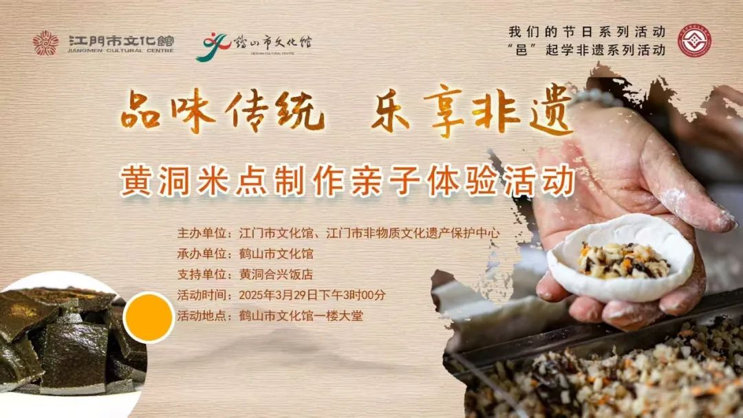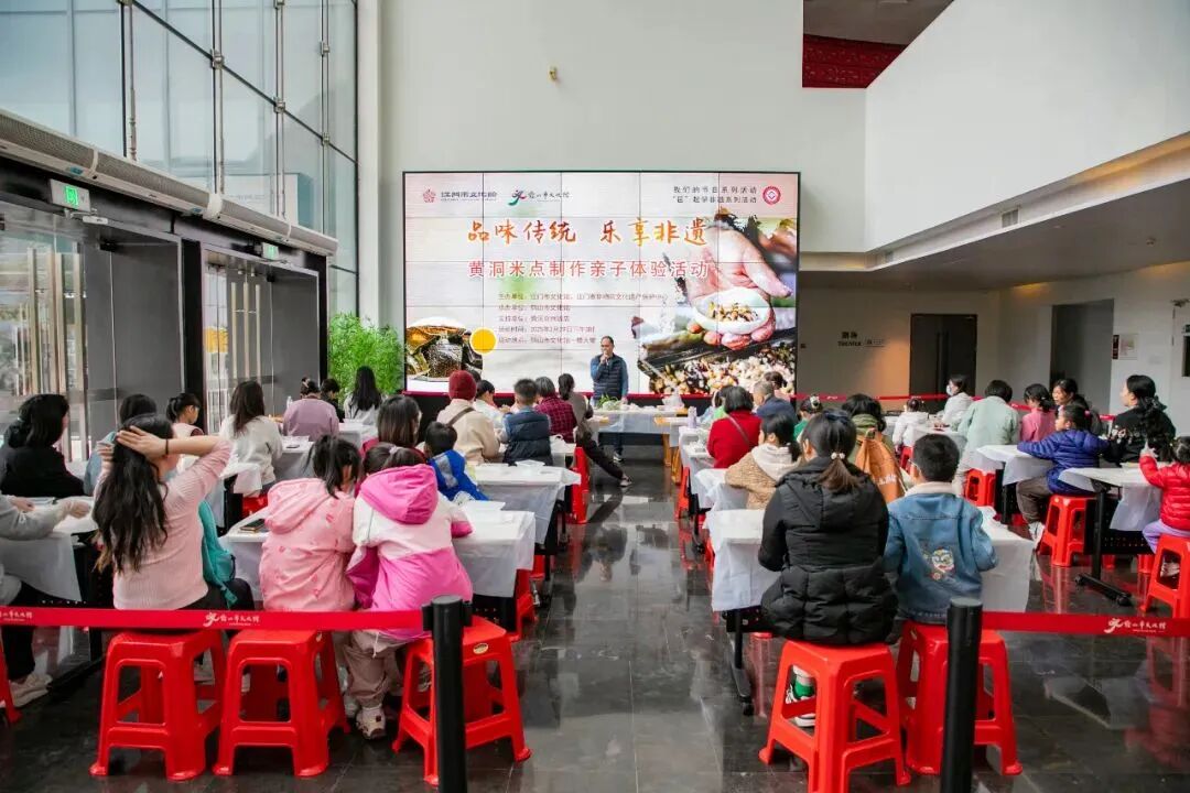3月29日下午,由江门市文化馆、江门市非物质文化遗产保护中心主办,鹤山市文化馆承办,黄洞合兴饭店支持的“我们的节日”、“邑”起学非遗系列活动,“品味传统 乐享非遗——黄洞米点制作亲子体验活动”在鹤山市文化馆一楼大堂举行。