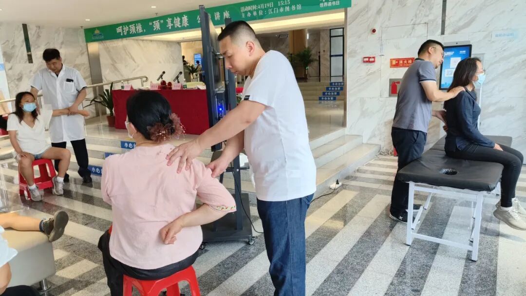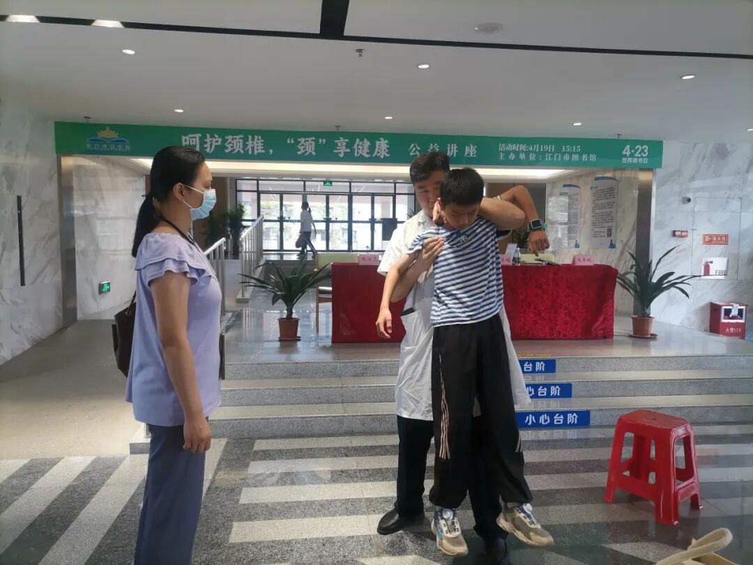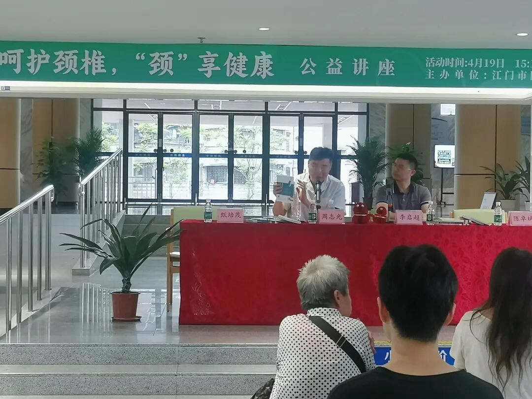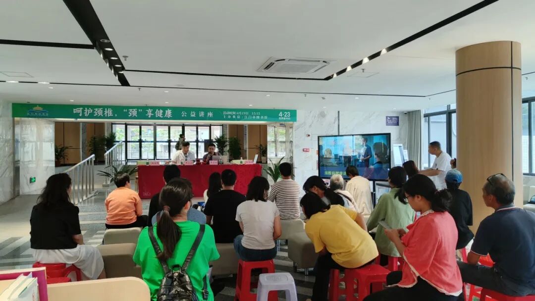 在4.23世界读书日来临之际,为倡导健康阅读理念,提升市民科普意识,江门市图书馆于4月19日成功举办“呵护颈椎,‘颈’享健康”公益讲座。活动以“知识科普+实践体验+阅读赋能”为核心,通过专家讲解、现场义诊、图书推荐等多元形式,吸引众多读者参与。活动反响热烈,市民读者聆听精彩讲座,体验推拿按摩,感受中医文化的独特魅力。