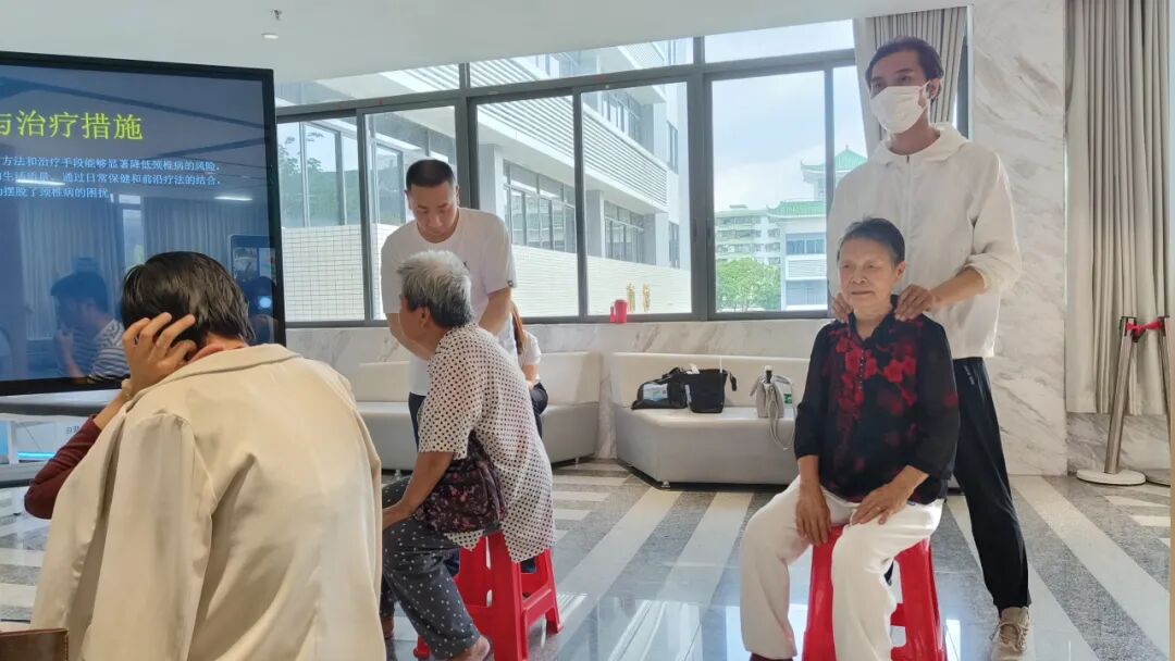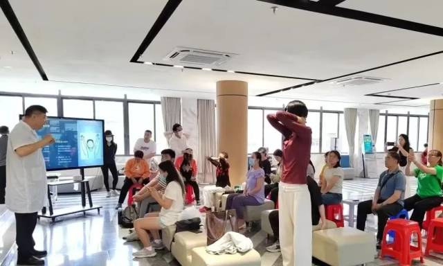 活动邀请江门市盲人协会义诊团队为市民读者开启一场“阅读与健康同行”的中医养生之旅。江门市盲人协会秘书长周志光、李启超两位老师主讲了颈椎病的成因与预防治疗措施。李启超老师深入剖析颈椎病的典型症状及成因,重点指出不良阅读姿势、长时间低头刷手机等现代生活方式对颈椎的危害;周老师则通过历史溯源:从《黄帝内经》《伤寒论》到明清推拿体系,揭示颈椎病防治的中医智慧,并现场演示简单实用的康复操如点头、转头等基本动作,配合肩部和上背部一起做放松运动。读者跟随示范动作练习,周老师一边做一边讲解穴位按压、伸展动作要领,强调“轻柔缓慢、循序渐进”原则。现场气氛热烈,参与者纷纷表示动作简单实用,可融入日常生活。在轻松愉悦的氛围中,读者不仅学到保健知识,更感受到中医文化的博大精深。