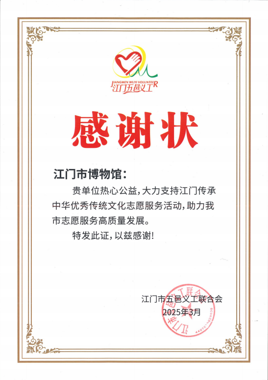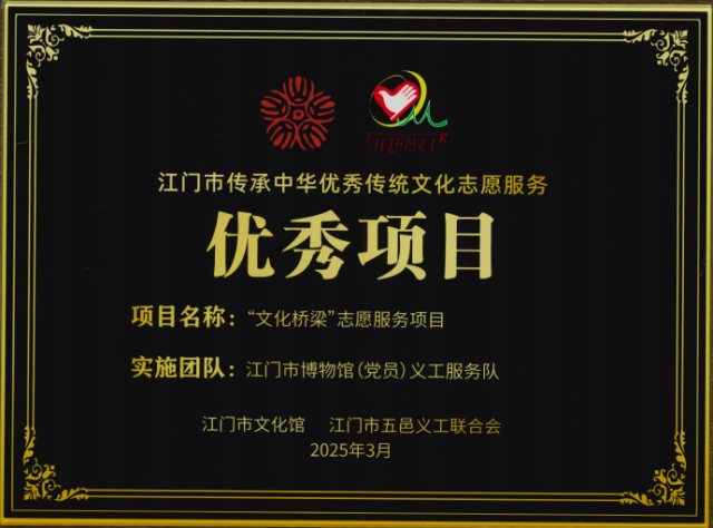 江门市博物馆(党员)义工服务队“文化桥梁”志愿服务项目被评为江门市传承中华优秀传统文化志愿服务优秀项目。