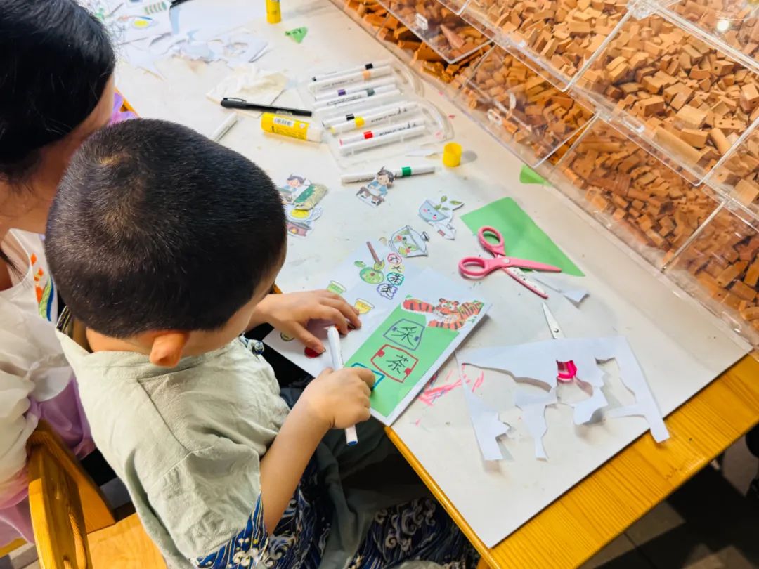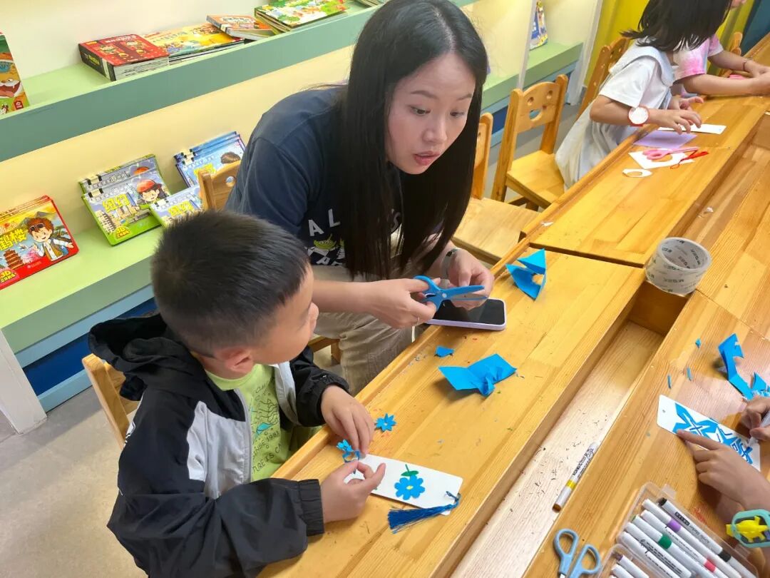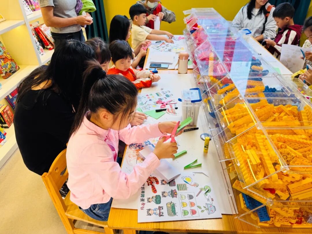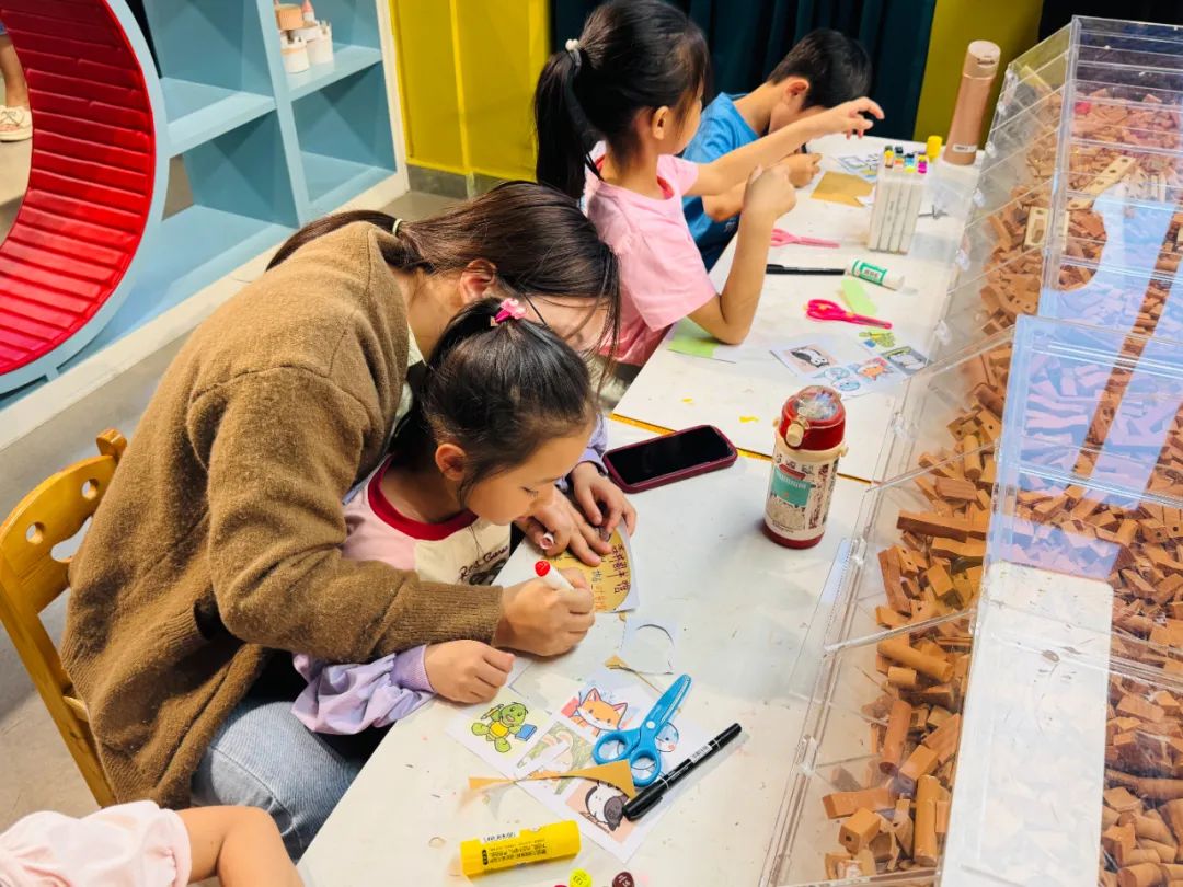 讲读结束后,手工创作环节“小书签”将活动推向又一个高潮。在志愿者老师的指导下,孩子们和家长们齐心协力,充分发挥创意,用彩纸、画笔、丝带等材料制作出独一无二的小书签。有的孩子在书签上画上可爱的小动物,有的描绘出自己心中的图书馆模样,还有的写上激励自己阅读的话语。家长们则在一旁耐心协助,与孩子共同完成这份充满意义的作品。一张张精美的小书签,不仅封存着亲子协作的温馨瞬间,更将化作孩子们遨游书海的 “引航标”,激励他们在阅读中品悟书香、浸润心灵。