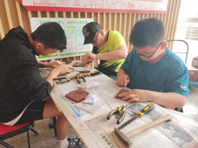 国家级代表性传承人廖惠林老师边用特制的电烙笔演示烙画工艺边讲解:“葵扇老叶纤维紧密,烙画时温度要像握毛笔般‘悬腕控力’—— 温度低了线条模糊,温度高了则会灼穿叶脉。”廖老师穿梭在学员之间,不时俯身指导。他握住一位学员的手,轻声说道:“别着急,就像写毛笔字,起笔要稳,运笔要匀。” 说着,他以腕力轻转笔锋,用虚笔烙出渐变肌理,原本普通的书签瞬间仿佛蒙上了一层朦胧的诗意。在老师的指导下,大家渐渐掌握了技巧。有人尝试烙制花鸟图案,先小心翼翼地勾勒轮廓,再用点烙的方式表现羽毛和花瓣的质感;有人挑战书法题字,一笔一画间,焦黄色的字迹逐渐在葵叶上清晰浮现。一名学员捧着自己初次完成的烙画书签,眼中满是惊喜:“以前只知道葵扇消暑,现在才明白每一道焦痕都是‘草木与火焰的共舞’—— 你得顺着它的纤维走向,它才会在高温下绽放出独有的纹路。”