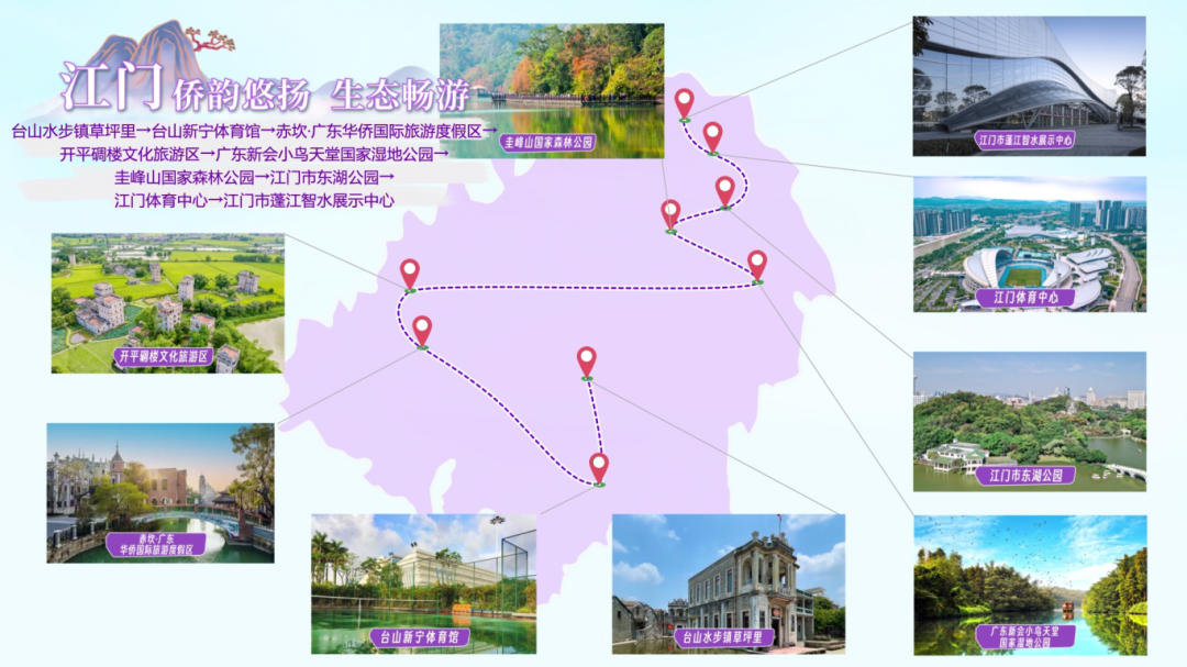 台山水步镇草坪里→台山新宁体育馆→赤坎·广东华侨国际旅游度假区→开平碉楼文化旅游区→广东新会小鸟天堂国家湿地公园→圭峰山国家森林公园→江门市东湖公园→江门体育中心→江门市蓬江智水展示中心