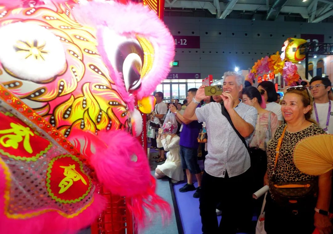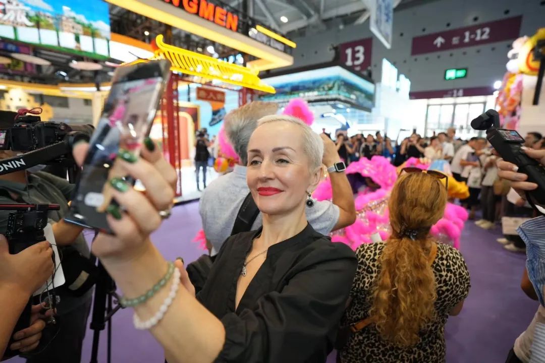 江门展区以“唐人街”为设计灵感,通过“江门商号、银信工坊、五邑茶坊、跟着影视游江门”四大板块构建文化叙事空间。在现场,来自不同国家的外籍客商来回穿梭,了解江门的文创精品、非遗技艺、陈皮产业、特色旅游、影视文化等。