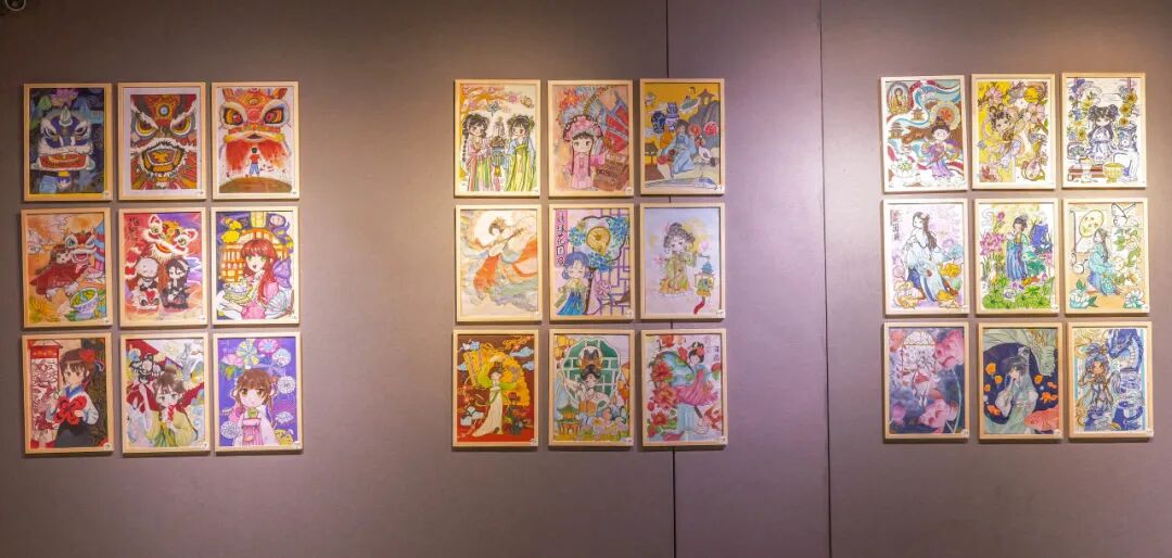移步一楼展厅,一幅幅色彩斑斓、构思奇崛的作品正静候观者——从气韵生动的国画、油画、水彩,到将传统纹样巧妙融入狮头、帆布袋、油纸伞的文创设计,侨乡少年们以独特视角诠释“国潮”真谛,在方寸之间绘就传统与现代的惊艳交响。