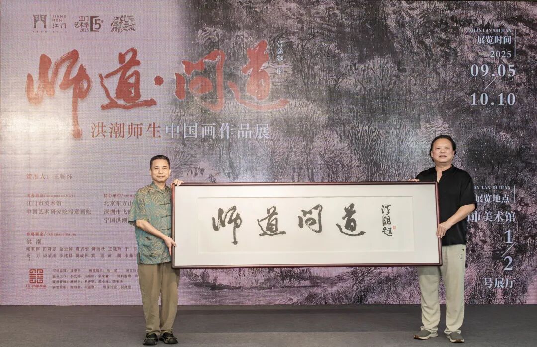 洪潮先生慷慨地将他的国画作品《心清无杂尘》、书法作品《师道问道》无偿捐赠给江门市美术馆永久收藏。江门市美术馆馆长王畅怀作为代表接受作品捐赠并向洪潮先生颁发收藏证书。
