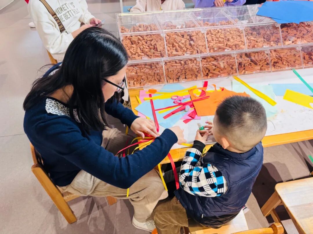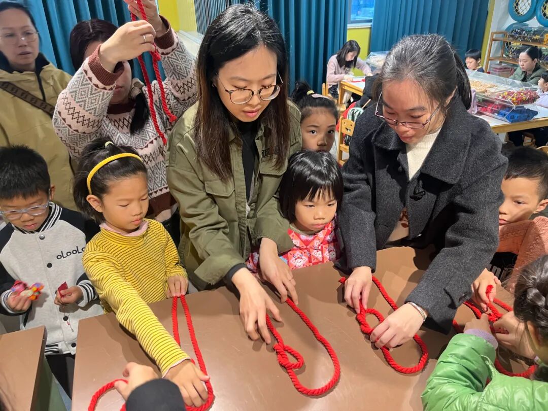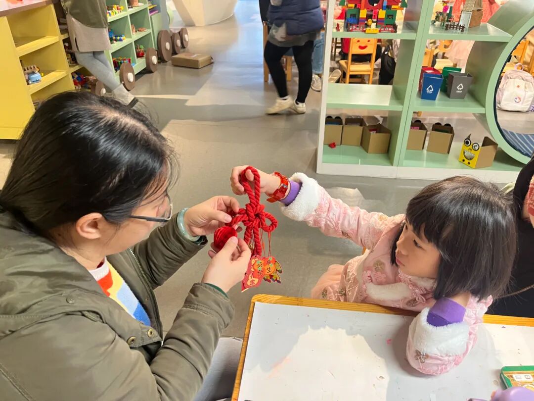 绘本讲读结束后,创意延伸手工环节“巧手编福,点亮年味”将活动推向高潮。结合绘本中西西编织窗花、中国结的情节,文化志愿者老师引导亲子合作,共同制作属于自己的新年饰品——编简易中国结,把绘本里的美好创意变成现实。家长与孩子分工协作,默契配合编织彩绳,打造小巧精致的中国结;还有的发挥创意,在饰品上增添可爱的装饰,用小手传递对新年的美好期许。
