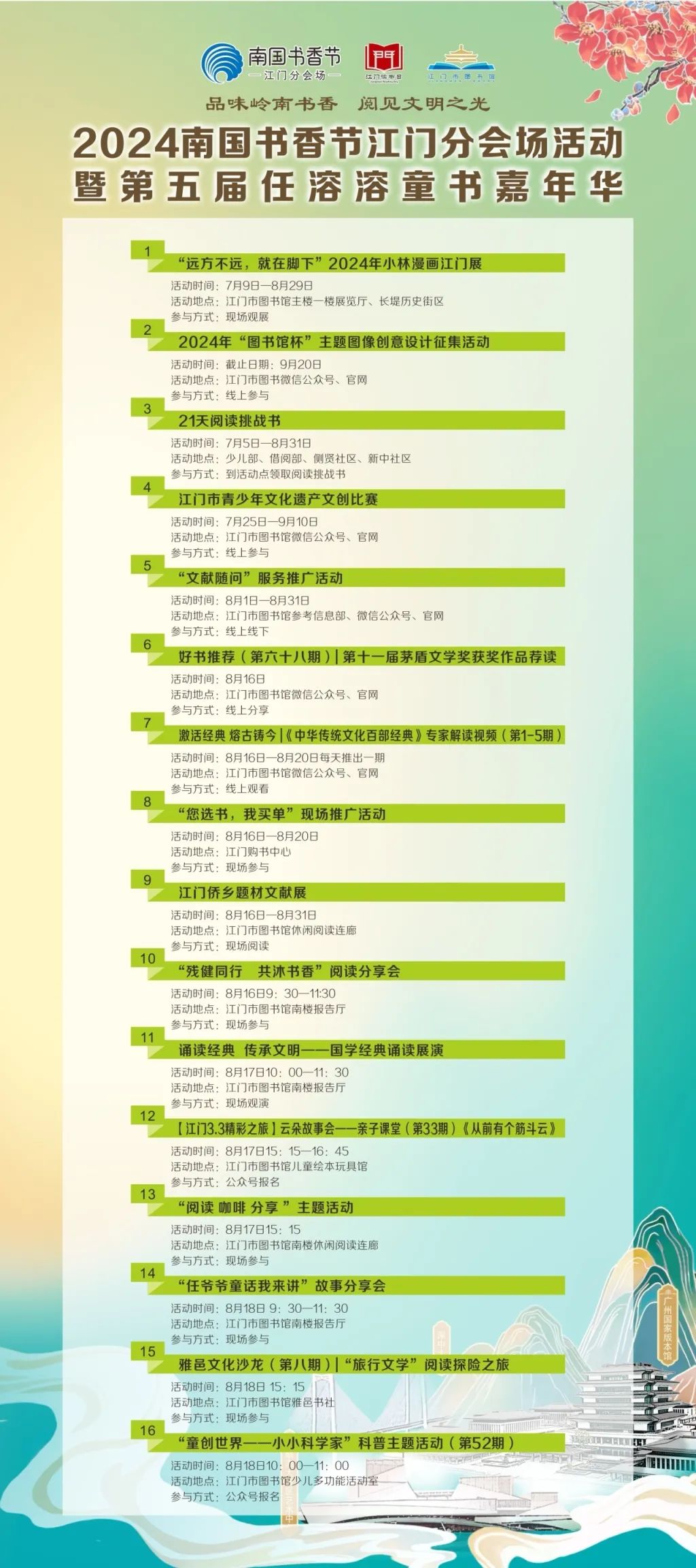 品味岭南书香,阅见文明之光。2024南国书香节将于8月16日—20日在全省拉开帷幕。为发挥南国书香节倡导全民阅读、以文化人、惠民利民的作用,满足人民群众精神文化需求,大力营造“爱读书、读好书、善读书”的全民阅读浓厚氛围,江门市图书馆为市民读者准备了主题鲜明、内容丰富、形式多样的文化活动,诚邀各位读者一起与书为伴,品味书香!