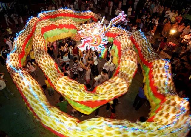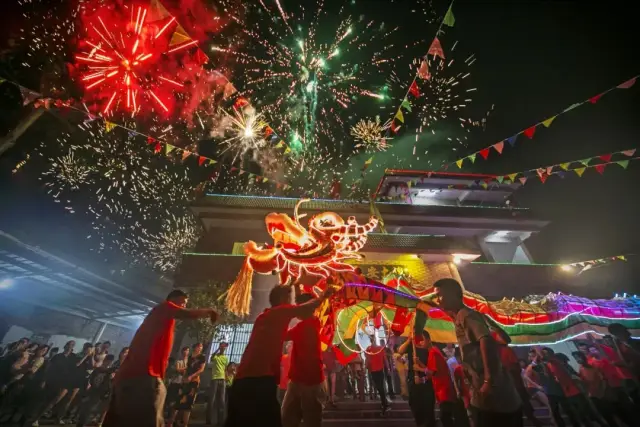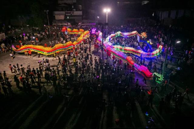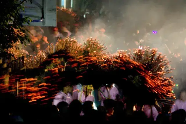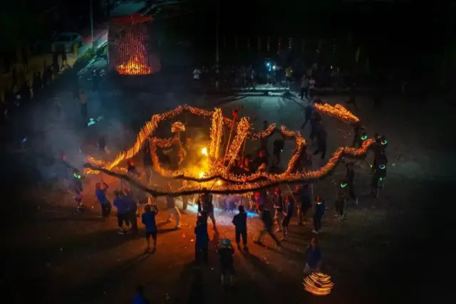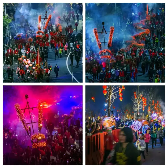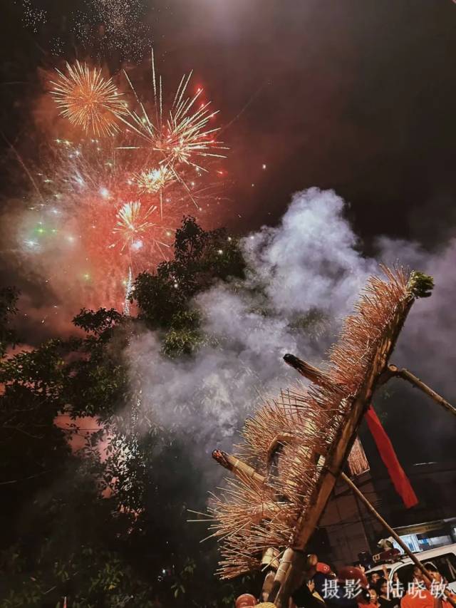 舞火龙此期间,还会有烟花助兴,加上观者如织,人声鼎沸,整个过程热闹非凡,场面蔚为壮观。