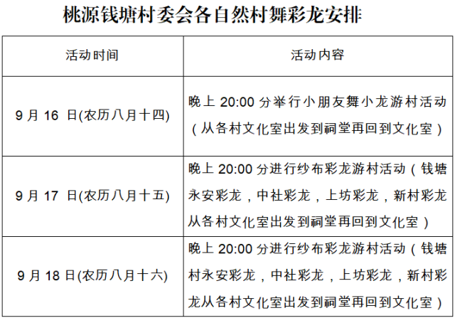 这个中秋,桃源镇钱塘村一年一度的中秋彩龙盛会将精彩上演,钱塘村永安彩龙、中社彩龙、上坊彩龙、新村彩龙将轮番起舞上演。
