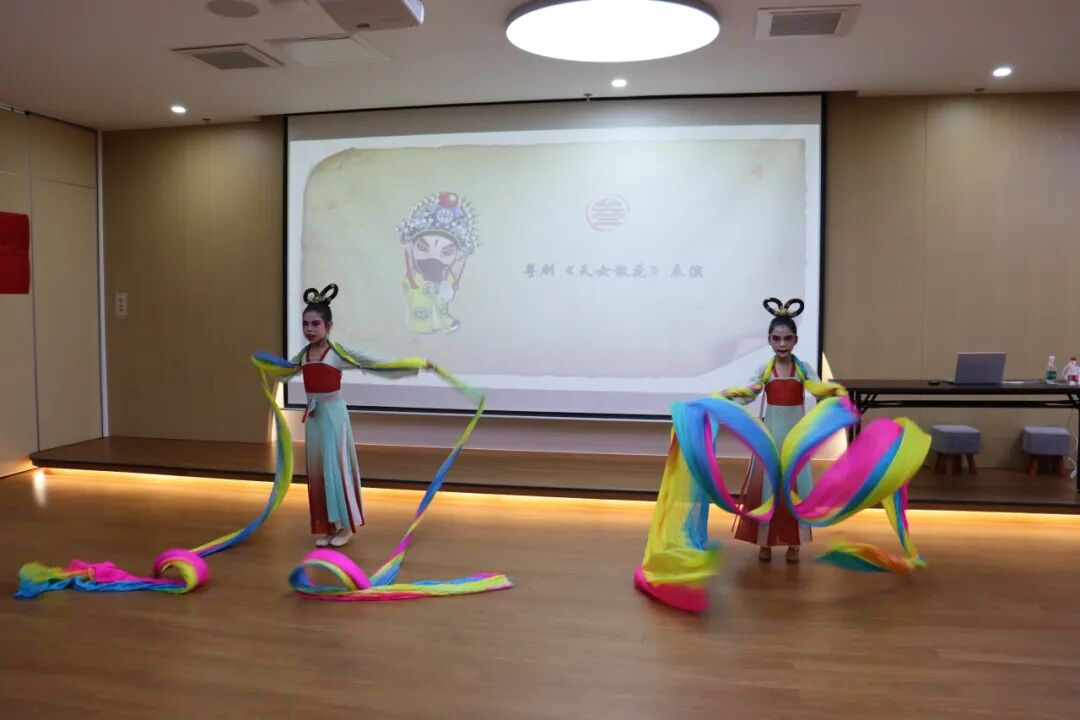 令人期待的粤剧《天女散花》表演将活动推向了高潮。两位粤剧小演员身着美丽的戏服、挽着长长的水袖,以优美的身段和婉转的唱腔,展现了粤剧的独特魅力。孩子们被精彩的表演所吸引,不时发出惊叹声和掌声。