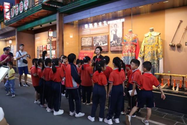 活动伊始,孩子们在博物馆讲解员陈老师的带领下参观了粤剧文化展品,孩子们近距离地感受着粤剧艺术的魅力,独特的服饰、演员精美的妆容以及各种表演道具令孩子们叹为观止。通过参观博物馆,孩子们认识到粤剧作为岭南文化的瑰宝,承载着无数的故事和情感,对粤剧文化有了初步的认识和感受。