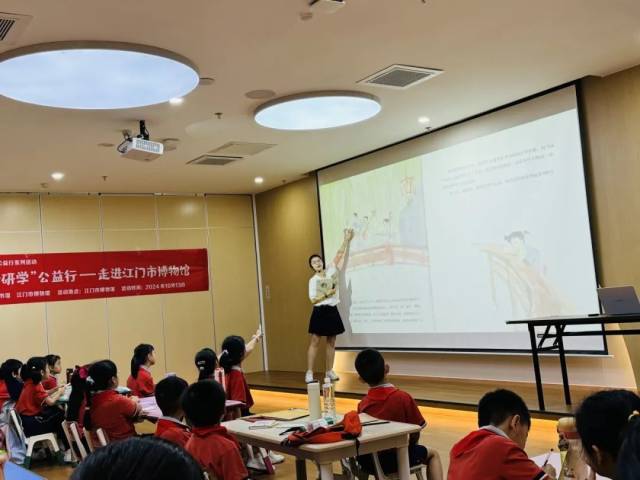 最后,为了让孩子们更好地了解五邑本土文化,活动设置了英文科普环节。江门职业技术学院英语教研室陈嘉恩老师用简单易懂的英文介绍了五邑地区的特色文化,如碉楼、陈皮、小鸟天堂、温泉等。孩子们积极参与互动,学习了一些与本土文化相关的英文词汇和表达。通过这个环节,孩子们不仅提高了英语水平,同时增强了对家乡文化的认同感和自豪感。