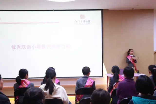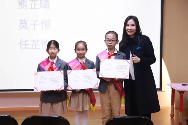 会议表彰了36名优秀成人志愿者、5名双语小导赏优秀指导教师、15名优秀双语小导赏,其中熊芷晴、莫子恒、任芷悠3名同学被评为五星优秀双语小导赏。