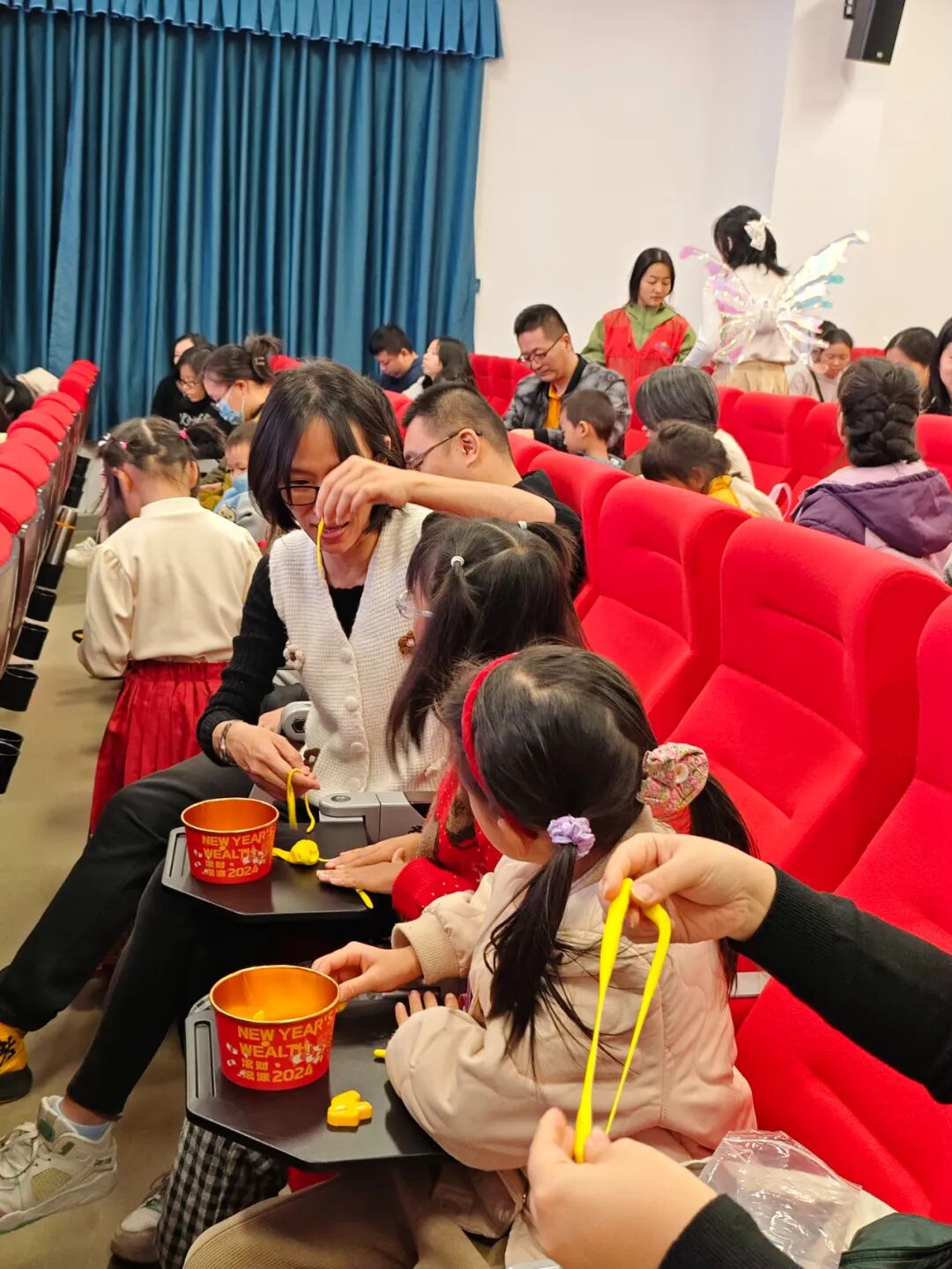 舞台上,演员们凭借精彩的表演和丰富多样的道具,将绘本中的世界栩栩如生地呈现在观众眼前。那憨态可掬、宛如娃娃的“小福气”,萌系十足、橘黄面庞搭配暖黄色大耳朵且手端面碗的小狐狸,以及灯笼、福字贴纸等节日元素,无不让人仿佛置身于绘本的奇妙情境之中。