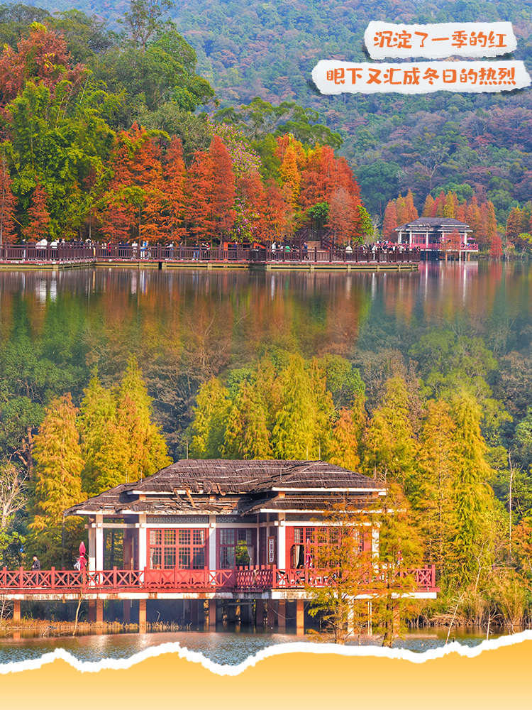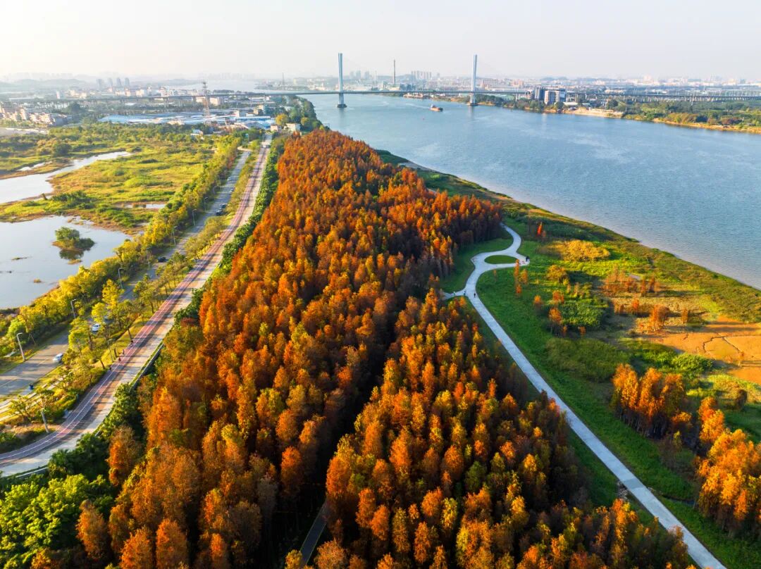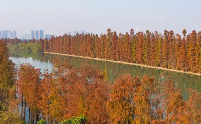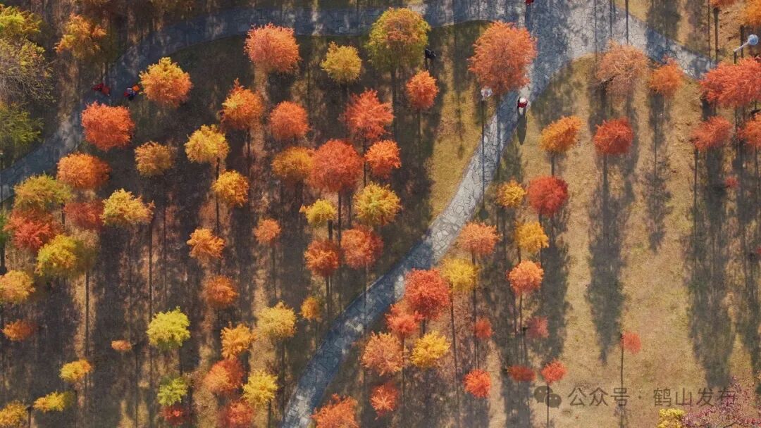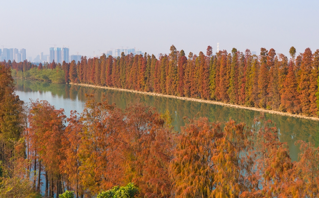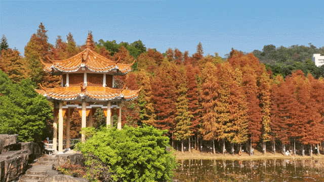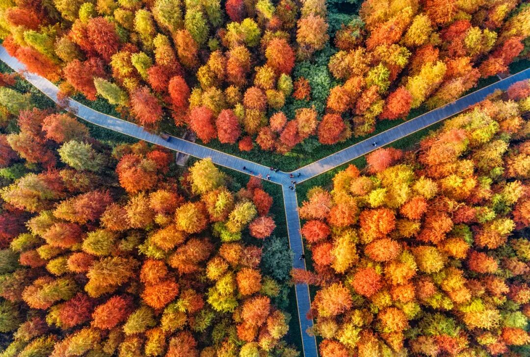 成片的杉树的树叶逐渐由绿转黄再转红,