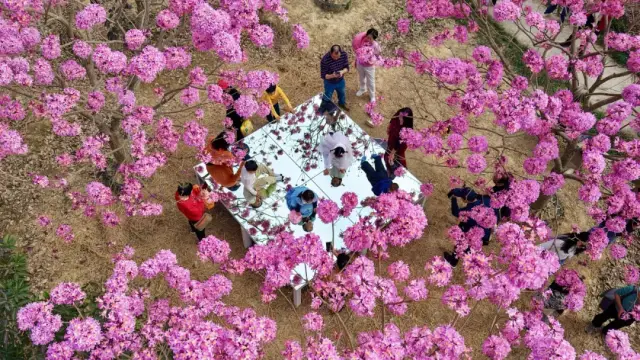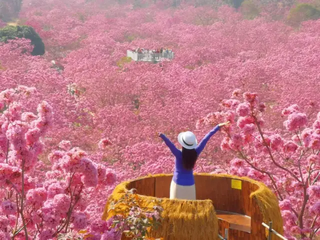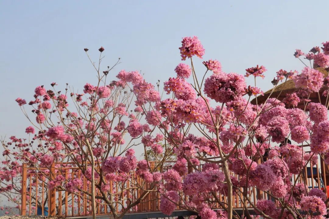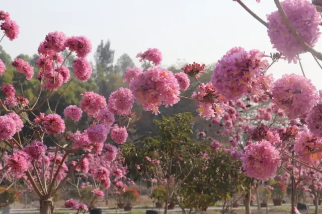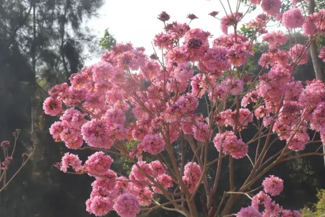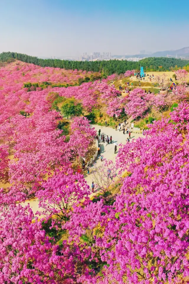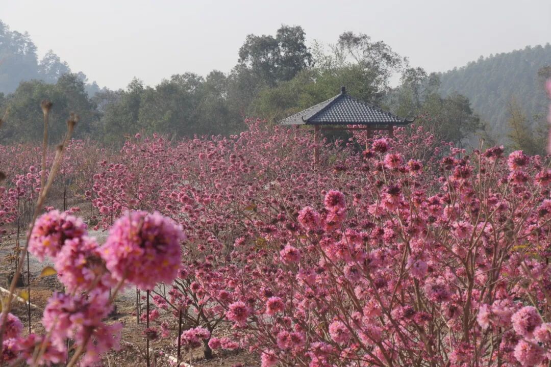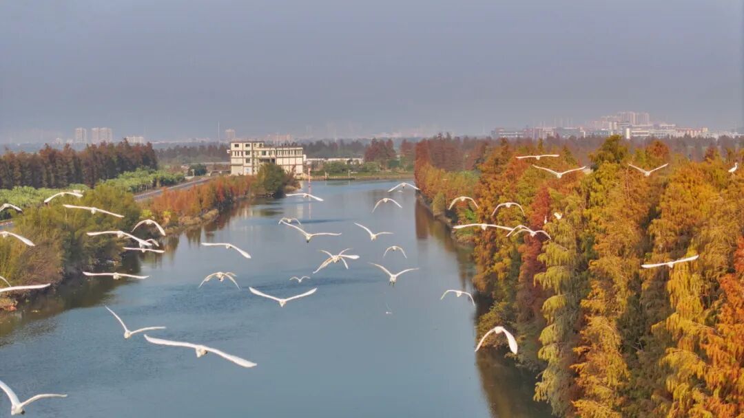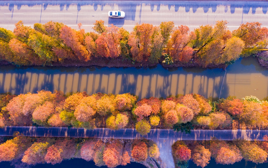 成片的杉树的树叶逐渐由绿转黄再转红,