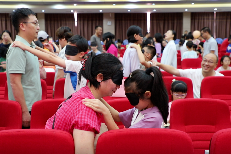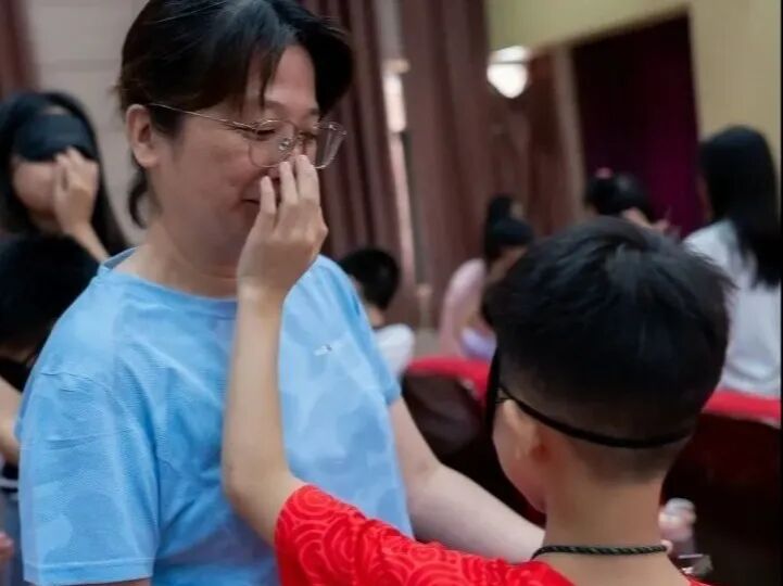 每一个人都像初绽的花蕾,带着懵懂与好奇,来到整个充满爱与温暖的世界。一双默默守护的眼睛,一双坚实支撑的手,或许这些平常没有用心感受过的肢体,却是每个人最应该珍惜和爱护的财富。“爱的画像”环节,孩子们戴上眼罩触摸父母的面庞,用触觉感知亲情的深沉,感恩父母健康体魄的馈赠和无私付出。