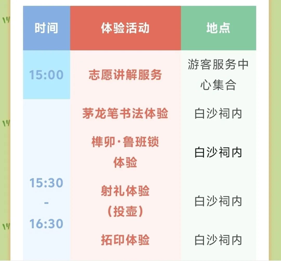 白沙国学堂系列常规体验活动如投壶、茅龙笔书法体验、纹饰拓印、蛇年剪纸和榫卯鲁班锁等体验活动,还将一如既往地向市民朋友开放。