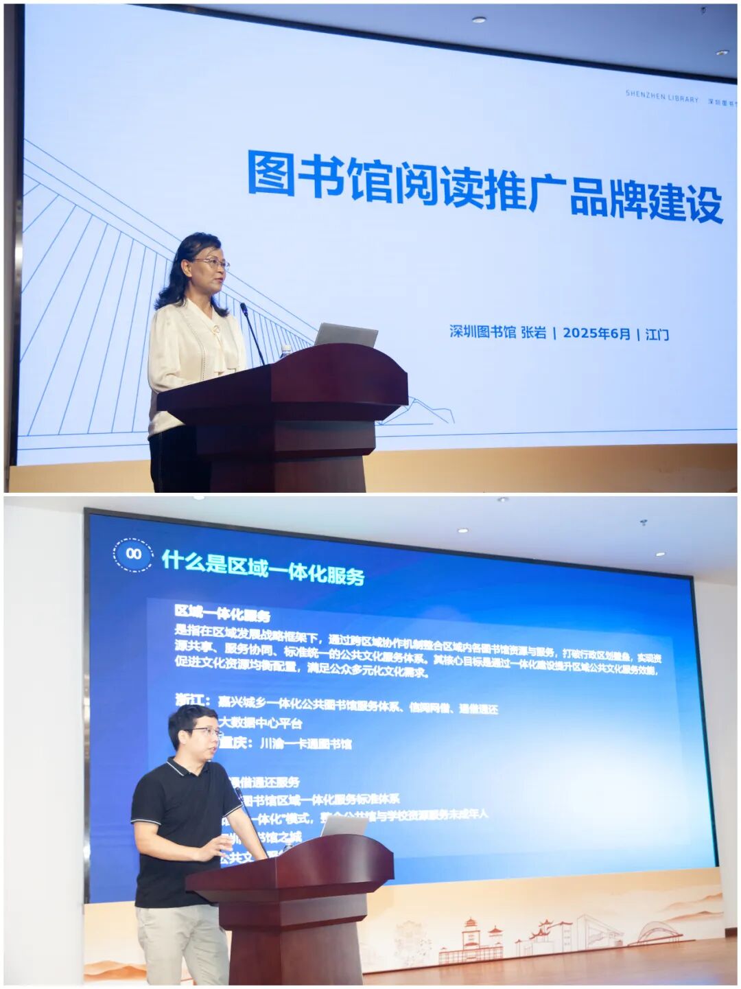 5日上午的培训环节由江门市图书馆副馆长黄晓辉主持。张岩以“图书馆阅读推广品牌建设”为主题,梳理当前图书馆阅读推广品牌建设中存在的普遍性问题,结合理论与实践从品牌定位、设计、传播与积淀等方面提出品牌建设的方法和对策。钱海钢以“区域一体化服务中的技术整合与智慧化发展”为主题,以广东省实践为例,解析区域一体化服务的核心概念、技术整合的关键路径与基层适配方案、智慧化服务场景的基层实践与创新对策。