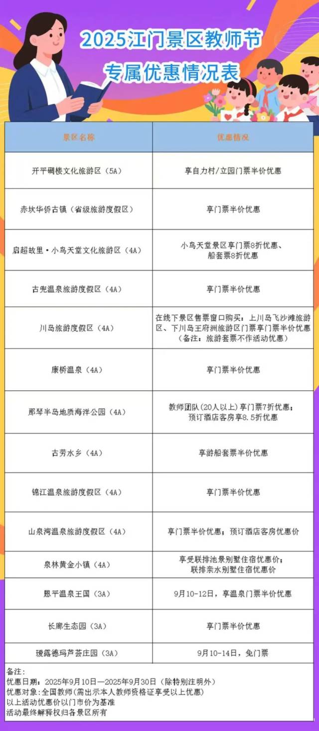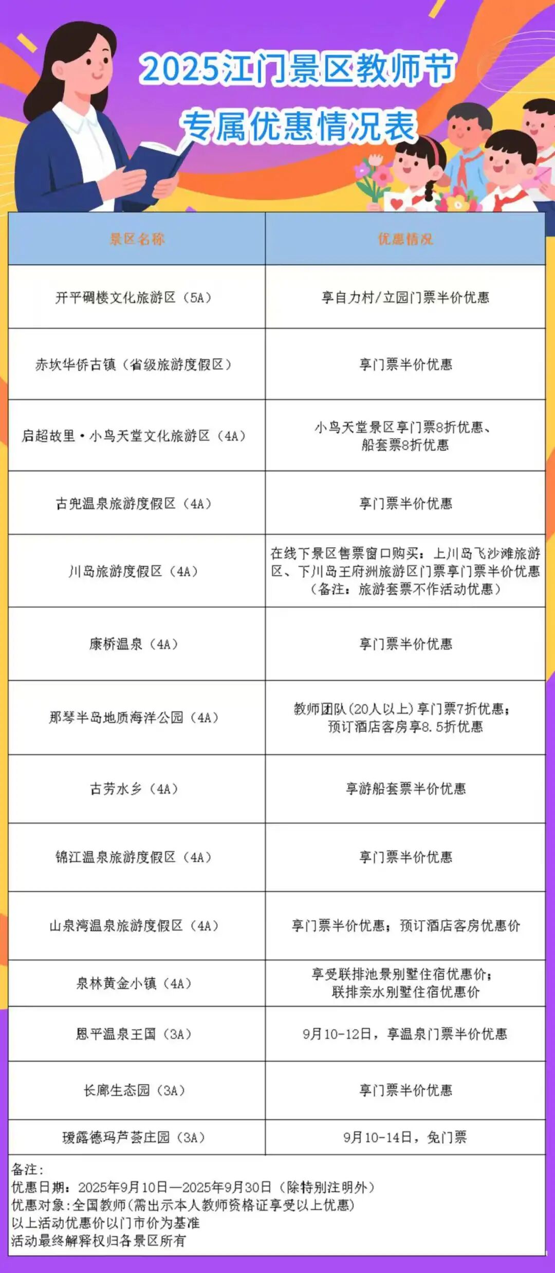 活动内容:凭有效教师证,享温泉门票半价优惠;此外,即日起至2025年9月10日,同行人员中1人出示有效教师证即可享受双人同行票福利,每张票均赠下午茶1份,双人同行双倍快乐。