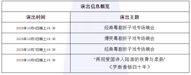 演出场次精彩丰富,门票数量有限,先到先得,欢迎各位观众朋友届时前往江门市粤剧传习所(东湖影剧院),共度一个充满粤韵风情的国庆、中秋佳节!