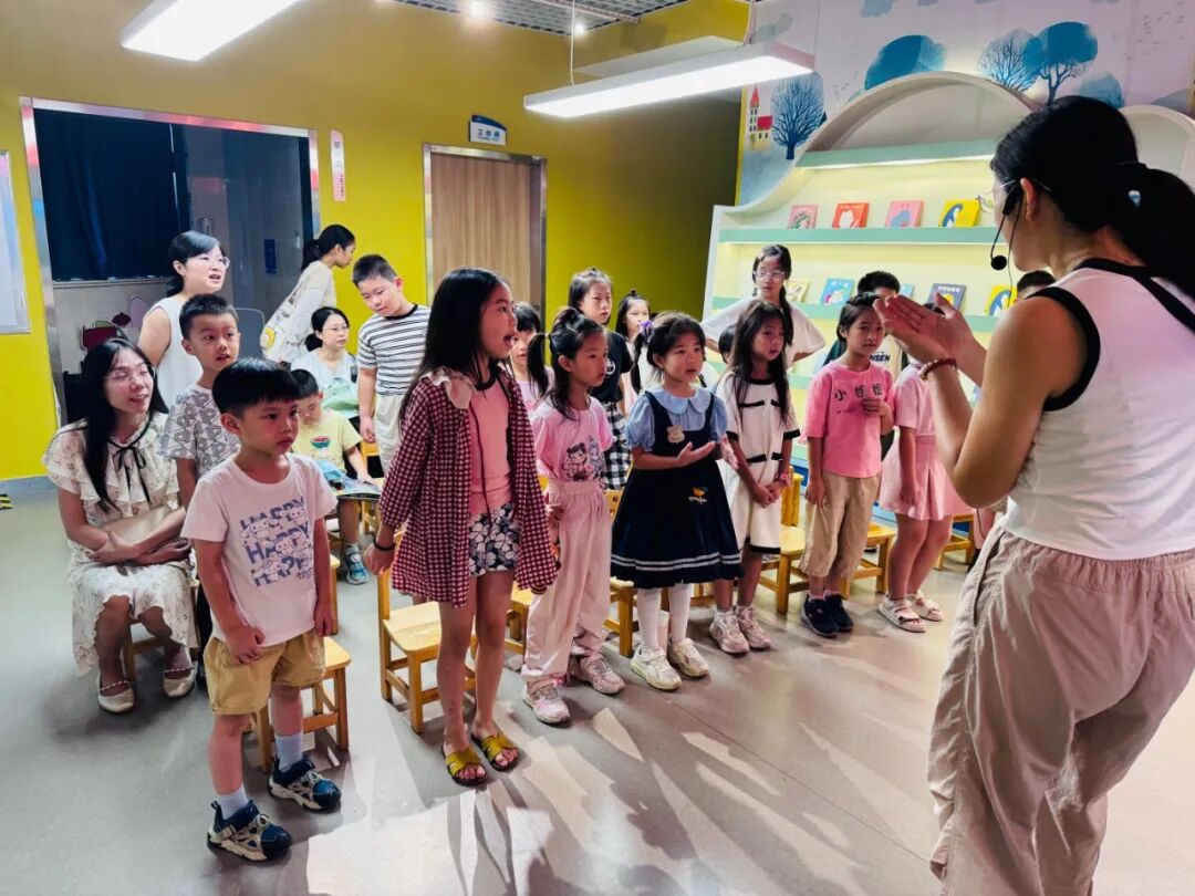 活动伊始,一段欢快的亲子互动英文歌《Our School》视频瞬间点燃了现场气氛。屏幕上,活泼的动画角色伴随着动感的节奏歌唱起舞,描绘着校园里的欢乐场景。志愿者老师带动孩子,大手牵着小手,跟着视频中的旋律轻轻摇摆,时而拍手,时而跺脚,稚嫩的歌声与家长温柔的和声交织在一起,成为现场最动听的 “亲子交响曲”。