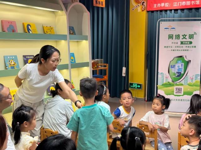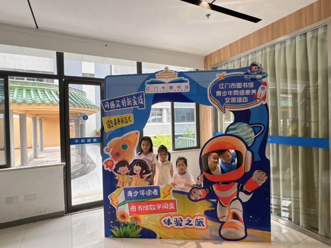 活动最后,亲子家庭在讲解员的带领下参观了江门市图书馆网络文明素养实践教育基地。作为广东省首批网络文明素养实践教育基地,江门市图书馆通过图文展板、互动屏幕等多种形式,系统展示了网络文明的重要性、网络谣言识别方法、个人信息保护技巧等内容。