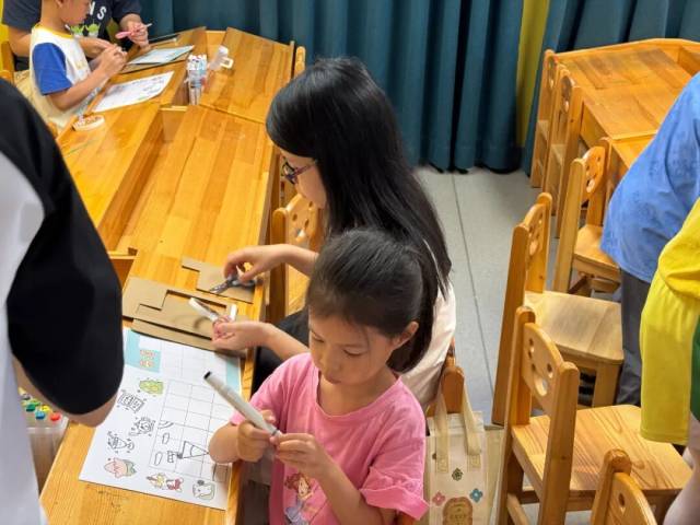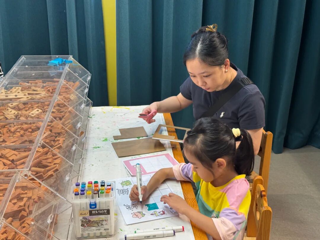 绘本讲读后,进入充满创意的手工制作环节。文化志愿者老师为每组家庭发放了手工“华容道”材料包,并详细讲解了传统益智游戏的历史背景与拼装技巧。亲子家庭分工协作,有的负责涂色描框,有的专注研究拼图布局,现场充满了欢声笑语。