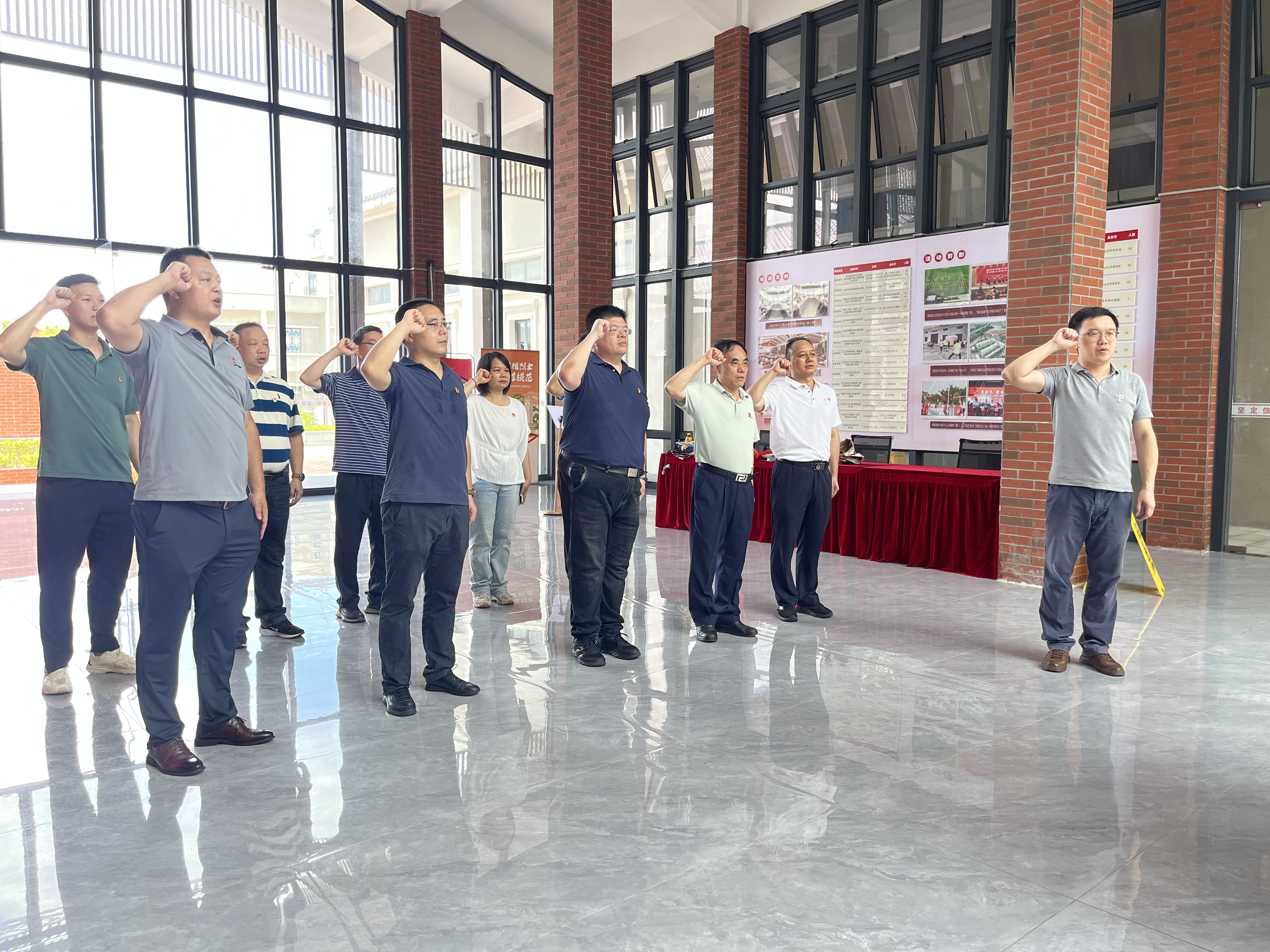 面对鲜红的中国共产党党旗,全体党员整齐列队,重温入党誓词。铿锵有力的誓言在纪念馆内回荡,一字一句,是党员们对党的忠诚承诺,更是对初心使命的再次坚定。