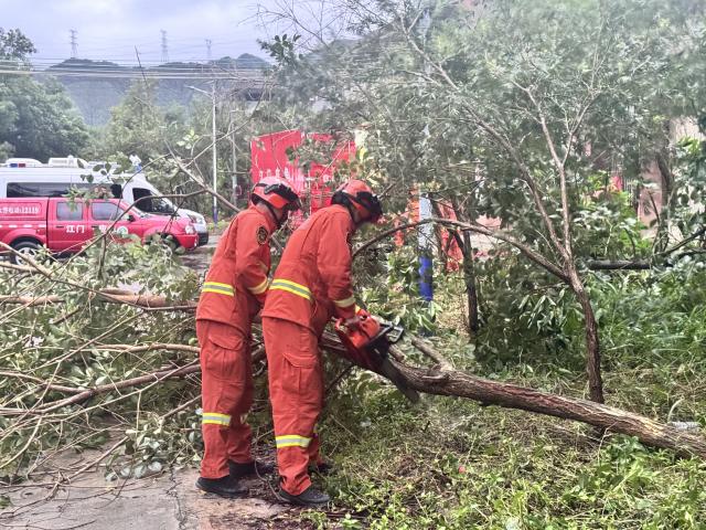 提前完成通信装备联调测试和救援装备检修工作,确保通信畅通、装备状态正常。20日19时,恩平市横陂镇横板圩的排洪水闸道路因台风导致树木倒伏,该水闸作为周边村庄排水的“咽喉要道”,抢险分队立即携带油锯赶赴现场。队员们在狂风暴雨中分工高效协作,锯断、搬运、清理同步作业,仅用40分钟便完成1公里道路倒木清理,及时恢复交通畅通。
