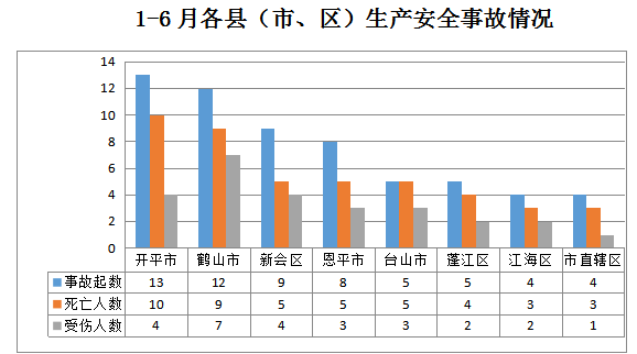 1-6月,市直辖区 发生事故4起(其中道路运输事故3起、水上运输事故1起);蓬江区发生交通运输和仓储业事故5起;江海区发生交通运输和仓储业事故4起;新会区发生交通运输和仓储业事故9起;台山市发生事故5起(其中商贸制造业事故1起、交通运输和仓储业事故4起);开平市发生交通运输和仓储业事故13起;鹤山市发生交通运输和仓储业事故12起;恩平市发生交通运输和仓储业事故8起。