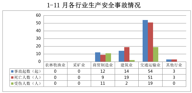 全市共发生生产安全事故83起,其中商贸制造业12起、占14%,建筑业14起、占17%,交通运输业54起、占65%,其他行业3起、占4%。农林牧渔业和采矿业未发生生产安全事故。