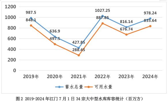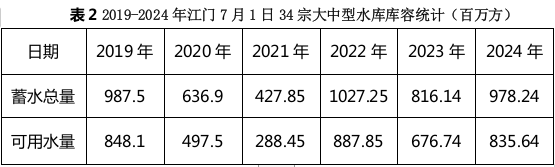 (三)水情:6月份西江来水平均流量25300m3/s,比常年多72%。7月1日,34宗大中型水库蓄水总量978.24百万方,较常年同期多13%,蓄水总量占总正常库容比例为75%,可用水量835.64百万方,占总兴利库容比例为72%;21宗供水水库蓄水总量701.71百万方,较常年同期多13%,可用水量580.17百万方,占兴利库容比例74%。