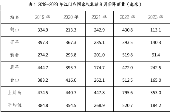 (二)风情:预计,月内可能有1~2个热带气旋影响我市,大致出现在中旬前中期、下旬中后期。据统计,2019-2023年8月份平均1.8个台风影响江门。